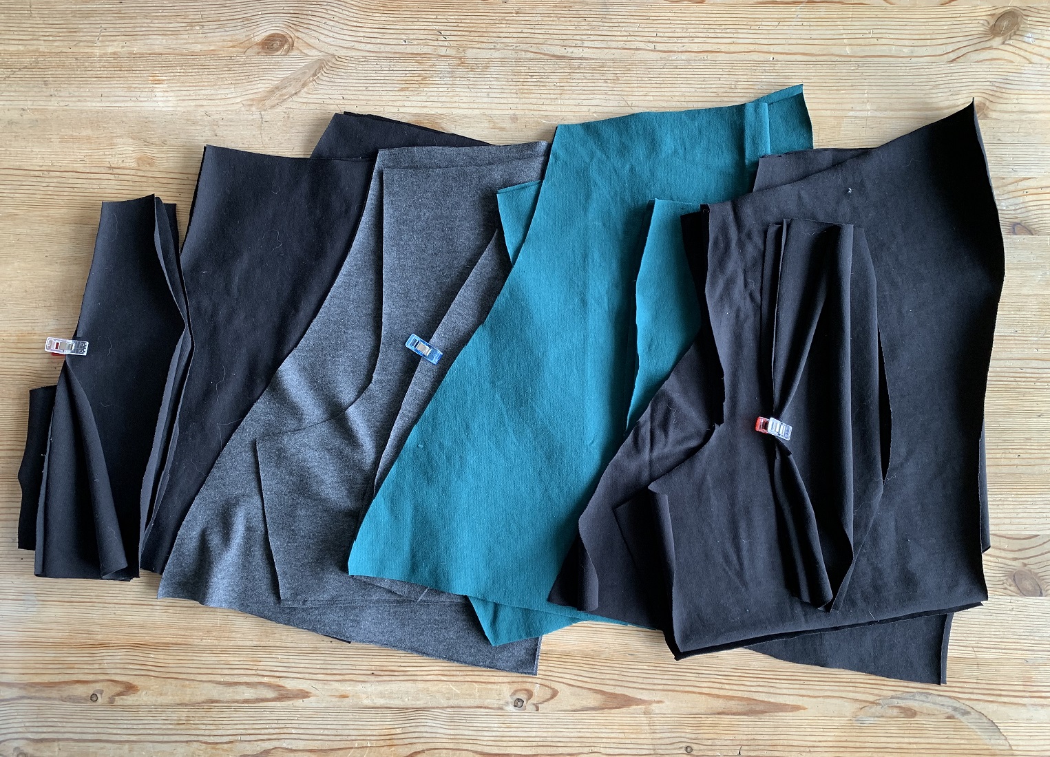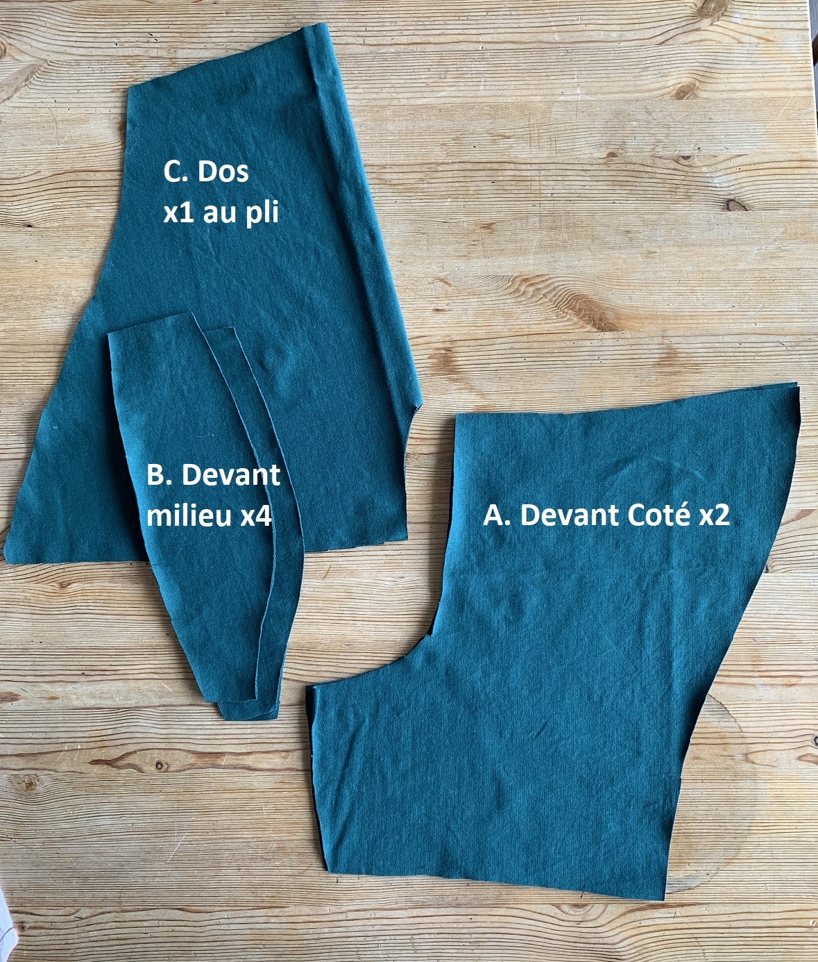 Étape 1 : on coupe les tissus. Il faut 2 « devants côté » (pièce A), 4 « devants milieu » (pièce B) et 1 dos coupé au pli (pièce C). J’ai coupé de quoi coudre 4 boxers d’un coup.