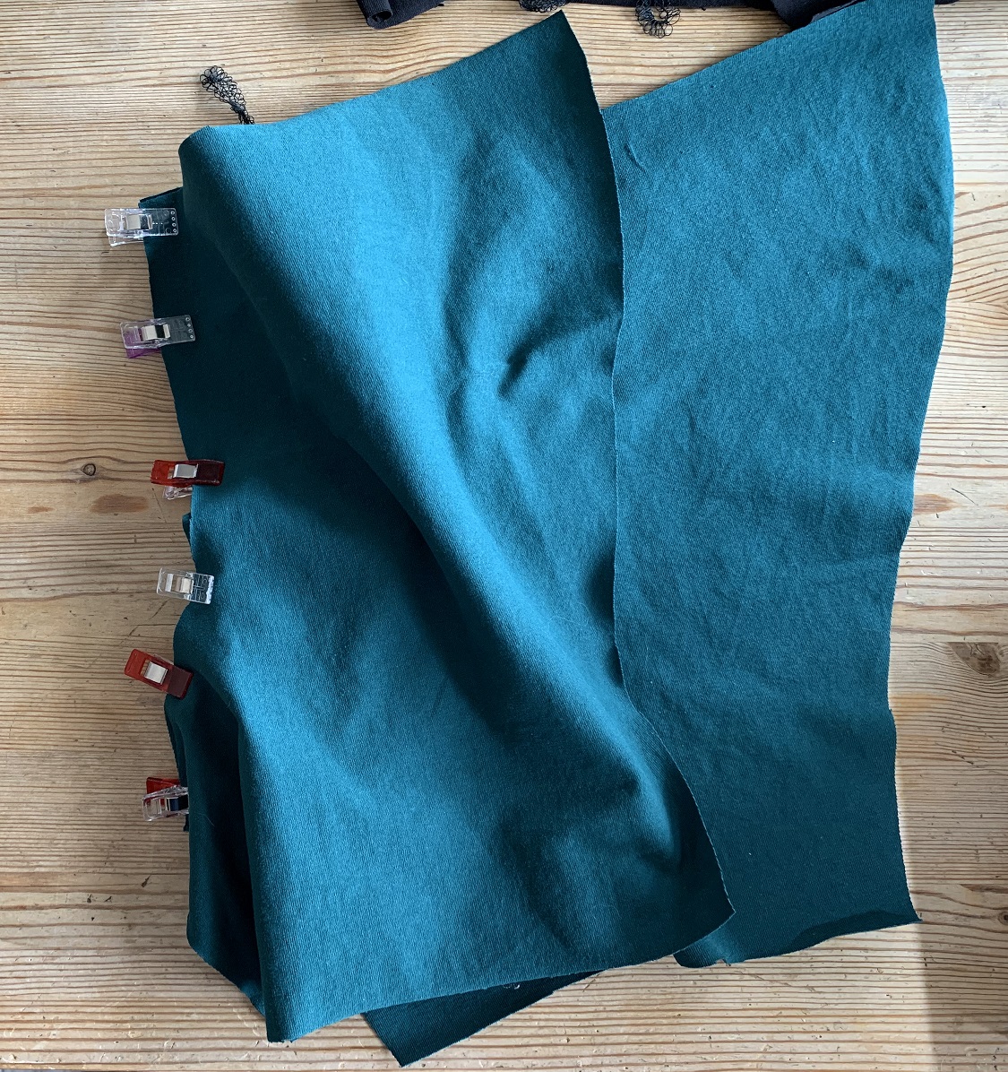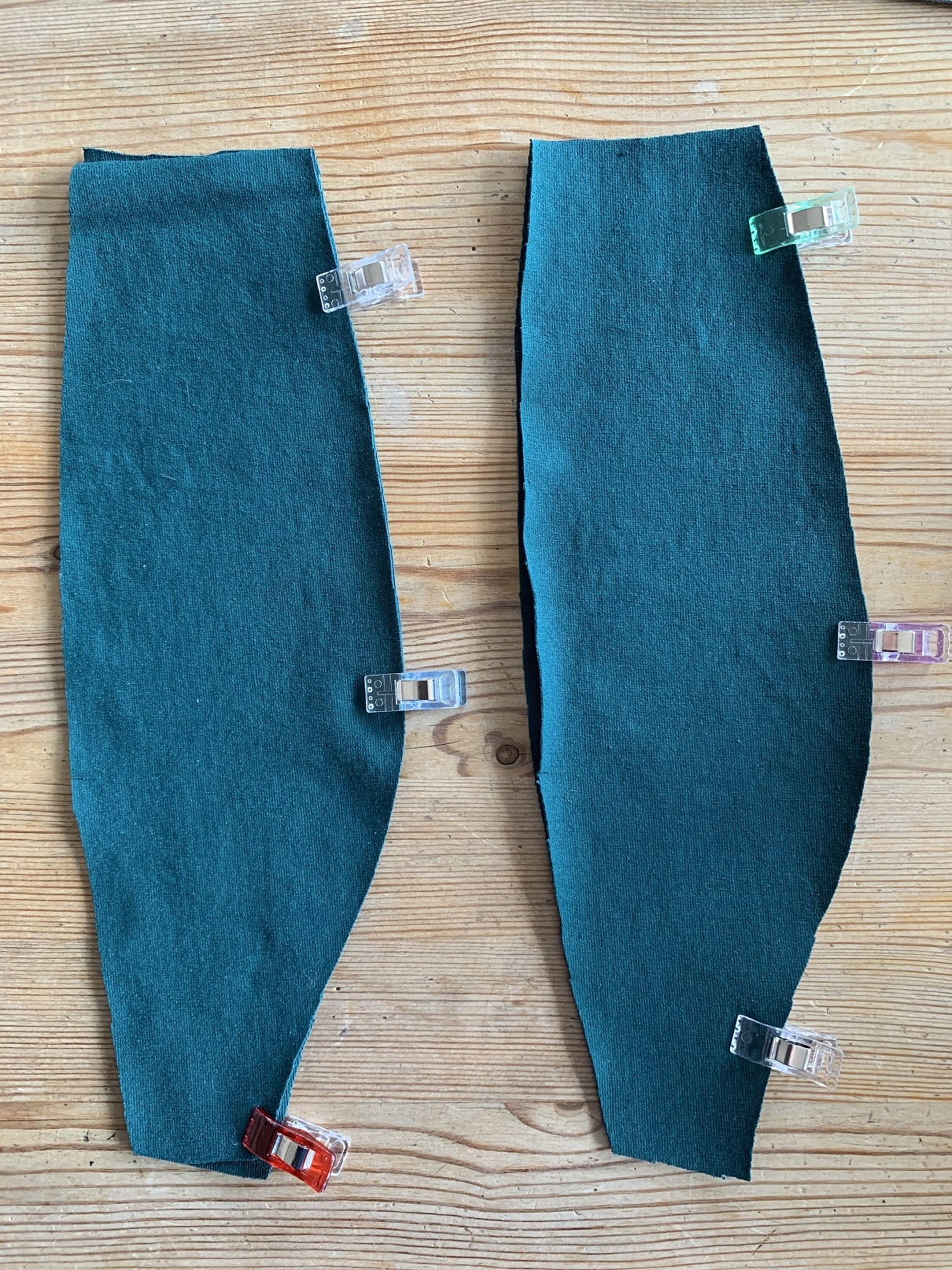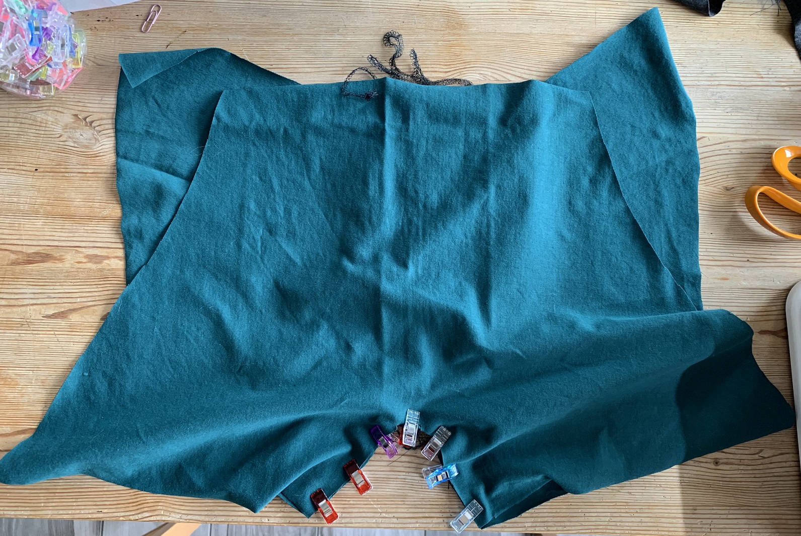 On commence par coudre les pièces « devant milieu », uniquement du côté bombé. Je couds à la surjeteuse mais c’est tout à fait réalisable à la machine à coudre, avec le point éclair.