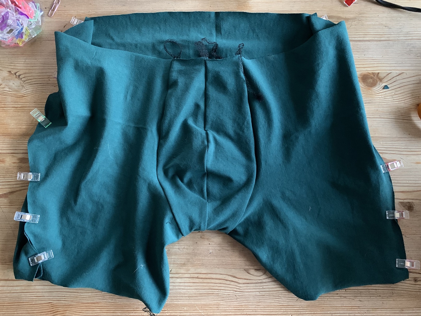 C’est l’étape la plus simple. On va venir coudre ensemble le devant brillamment réalisé précédemment et le dos. On commence par la couture d’entrejambe, il suffit de coudre endroit contre endroit puis de surpiquer pour maintenir la marge de couture vers l’arrière.