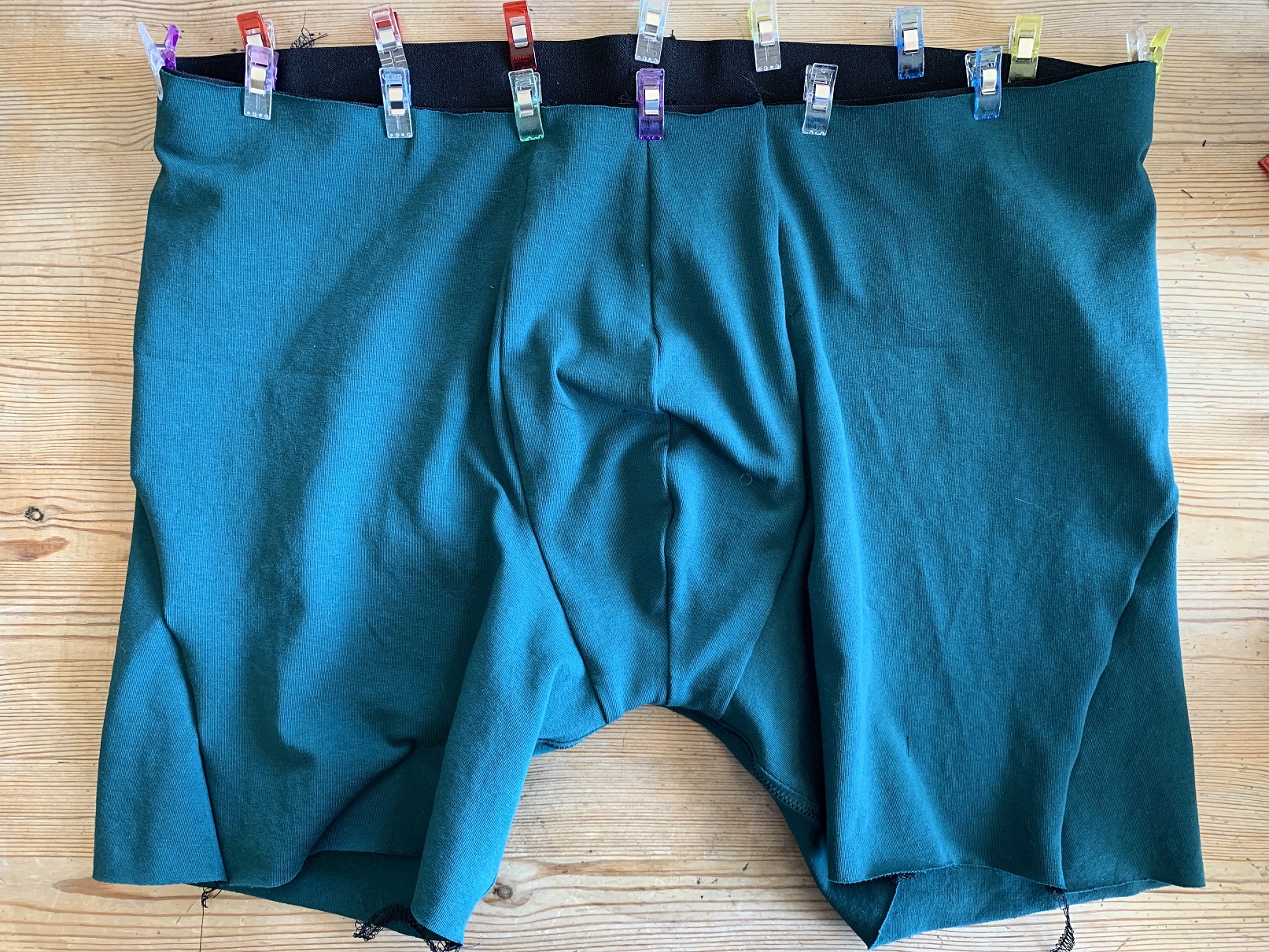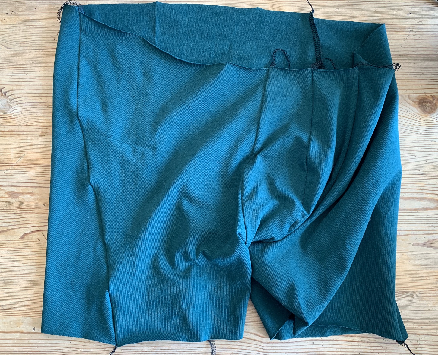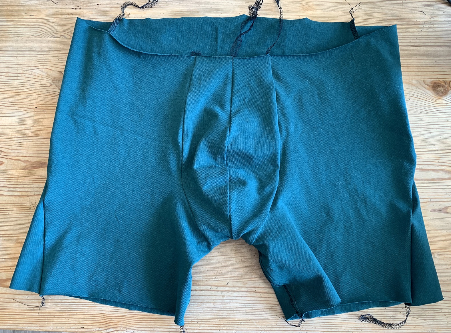 Ensuite on coud les côtés, endroit contre endroit. Le boxer a des coutures obliques sur les côtés, le dos revient donc sur le devant et c’est normal.