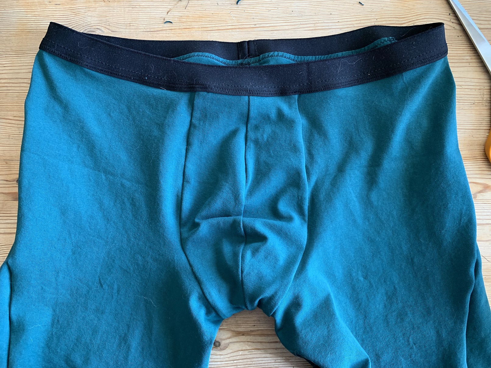 Cette étape est la plus difficile du patron mais une fois que vous aurez compris le processus, vous vous direz « ah ben c’est pas si compliqué en fait 😉 » Bon, l’étape 2 est terminée, on vient de coudre le devant du boxer.