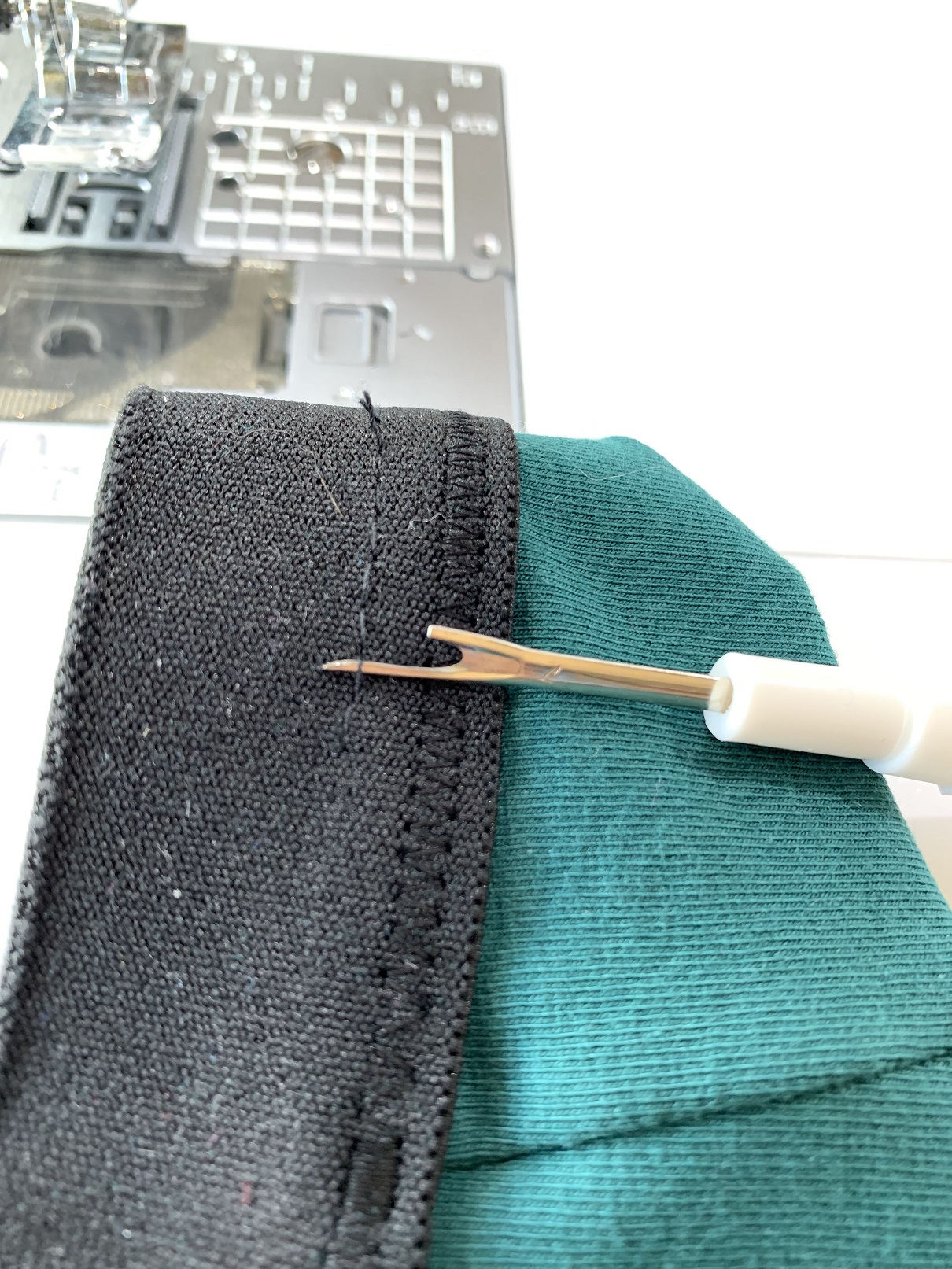 Maintenant que l’élastique est bien en place, on peut le coudre définitivement. Utilisez un point zig-zag ou une aiguille double ou encore une recouvreuse mais si vous avez la chance d’être l’heureuse propriétaire d’une recouvreuse, je doute que vous ayez besoin de mon petit tuto ! Une fois l’élastique cousu, enlevez le fil de bâti.