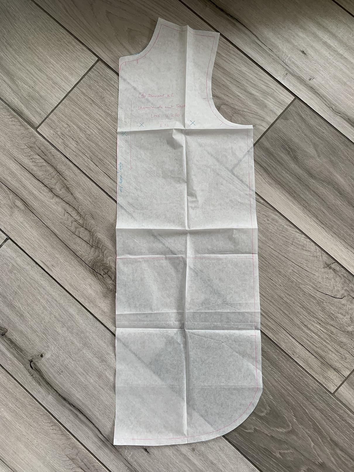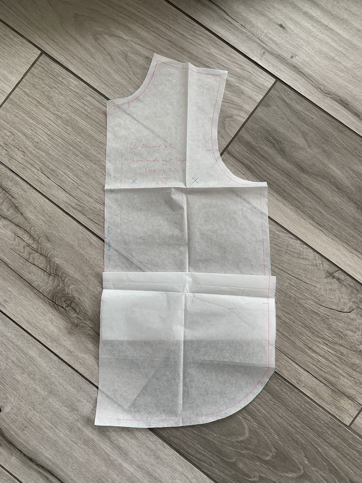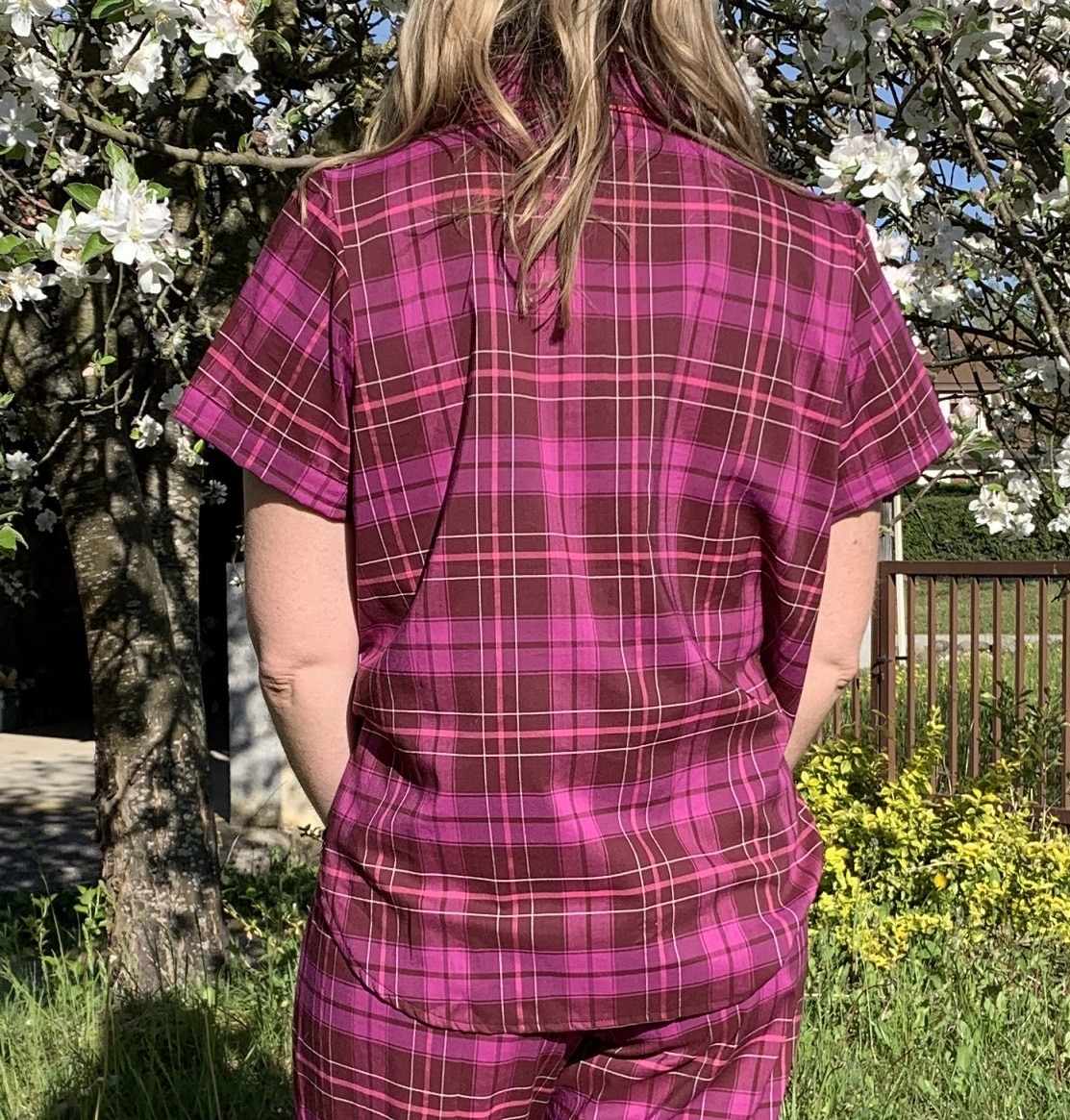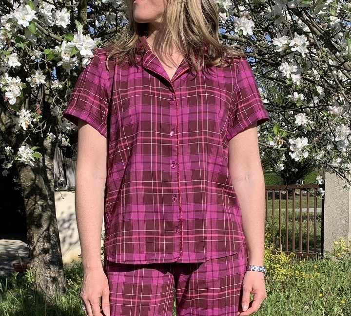 L’année dernière je m’étais cousu un pyjama en flanelle hyper confortable et avec le retour des beaux jours, j’ai eu envie de me coudre une version plus légère. J’ai donc utilisé à nouveau le patron de la chemise de nuit Saga (La Maison Victor 1/2020) que j’ai raccourci en chemise. Rien de bien difficile, il suffit de faire un pliage « en accordéon »: