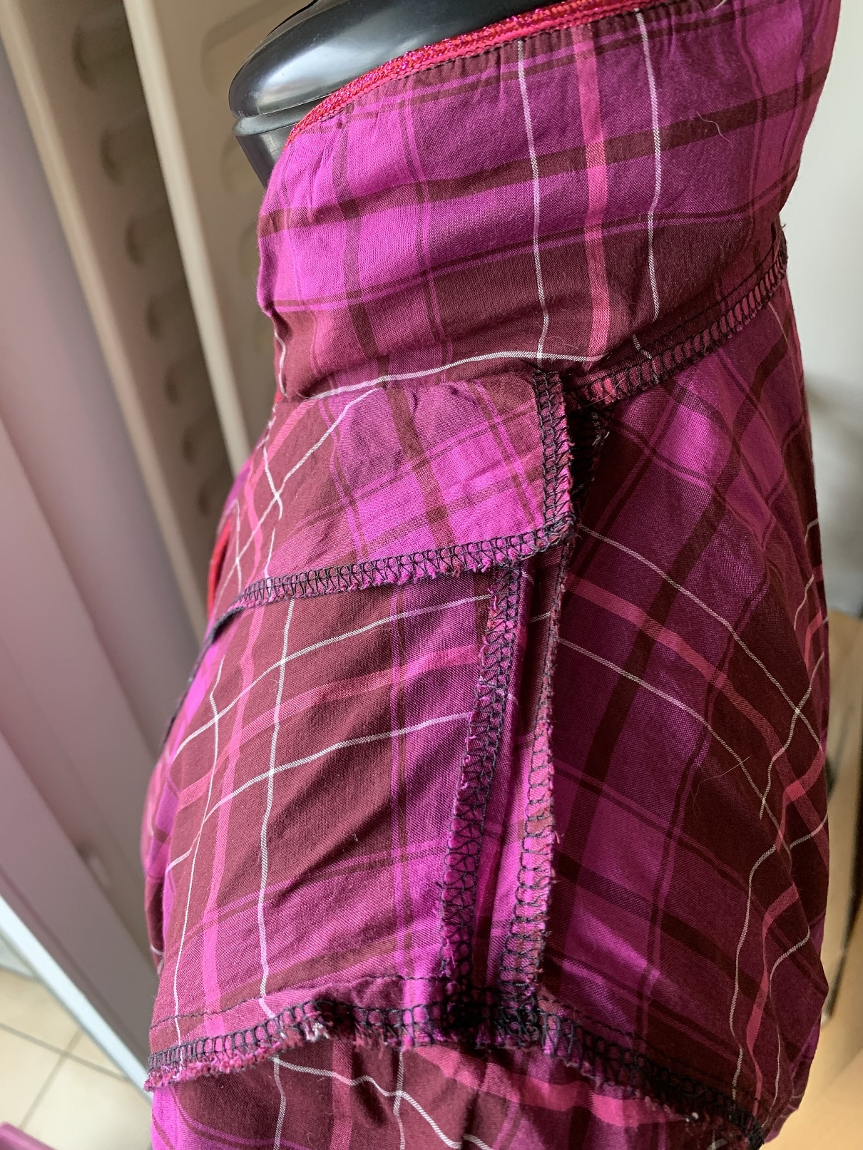Le haut du pantalon se replie pour former la ceinture dans laquelle on glisse un élastique. J’ai souhaité rajouter un cordon et pour cela, j’ai cousu deux boutonnières de chaque côté du milieu devant :