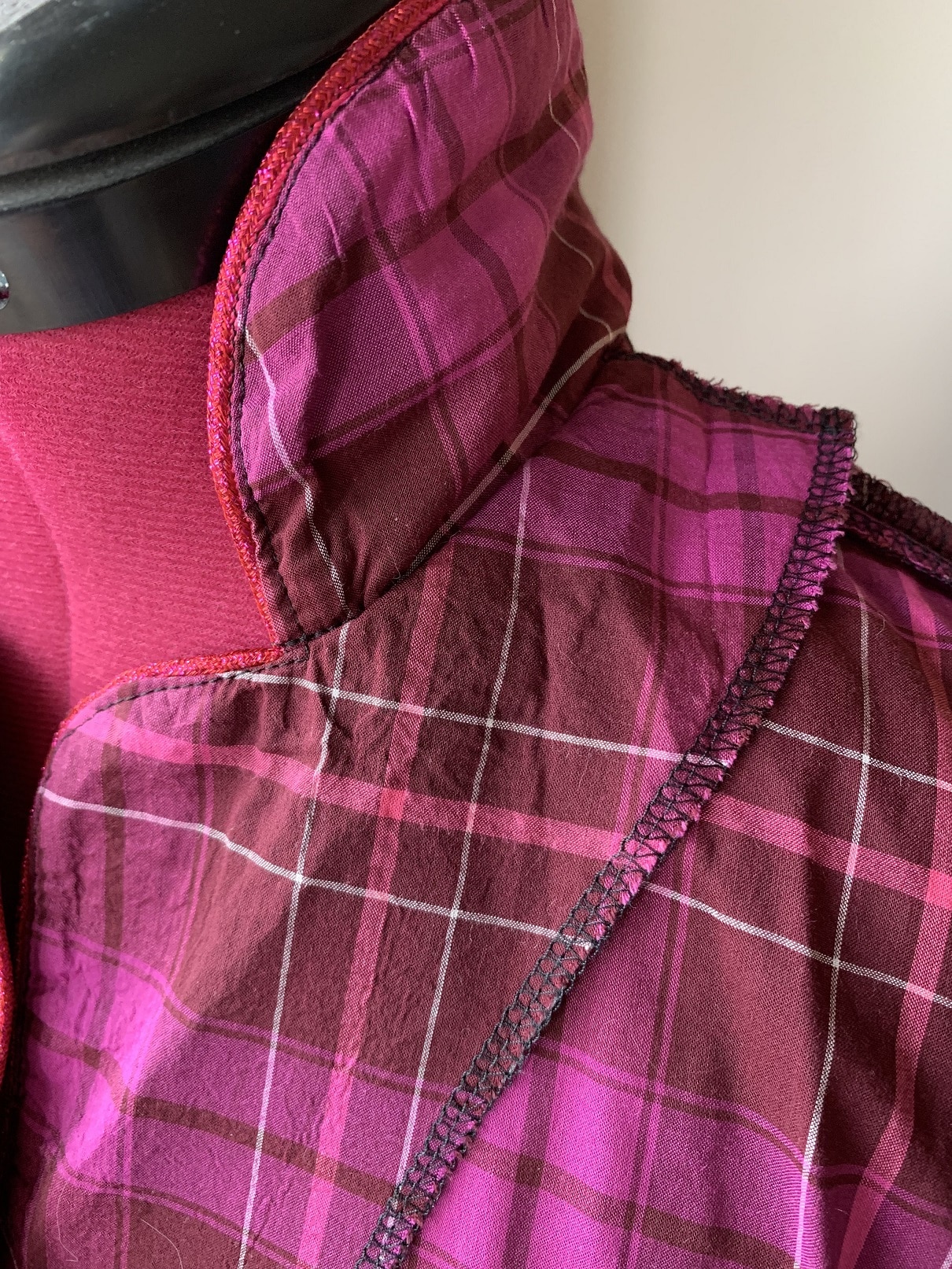 Le tissu, une fibranne de viscose, vient de chez Bennytex. J’ai ajouté un passepoil et des boutons à paillettes de mon stock. Le seul point technique un peu difficile est la couture du col avec la parementure. Je vous mets des photos de l’intérieur de la chemise ; n’hésitez pas à me contacter si vous bloquez sur ce point, ce sera l’occasion pour moi d’en coudre une 3e version avec plus de photos !
