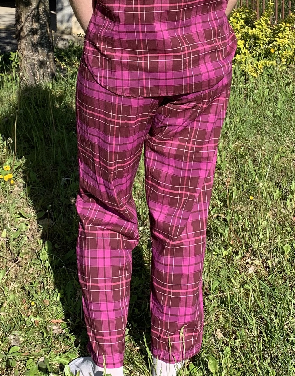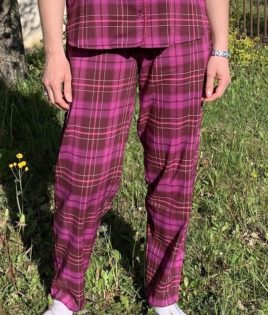 Je me suis ensuite attaquée au bas. Pour ma première version, j’avais utilisé le patron du pantalon de pyjama Février, issu du livre « ma garde robe à coudre pour toute l’année » de Charlotte Auzou. Malheureusement, il ne me convenait pas car la ceinture dos est trop basse pour moi. J’ai donc décidé d’utiliser le patron du short Prue de La Maison Victor 2/2019. Comme son nom l’indique, c’est un short et je l’ai donc rallongé directement sur le tissu.