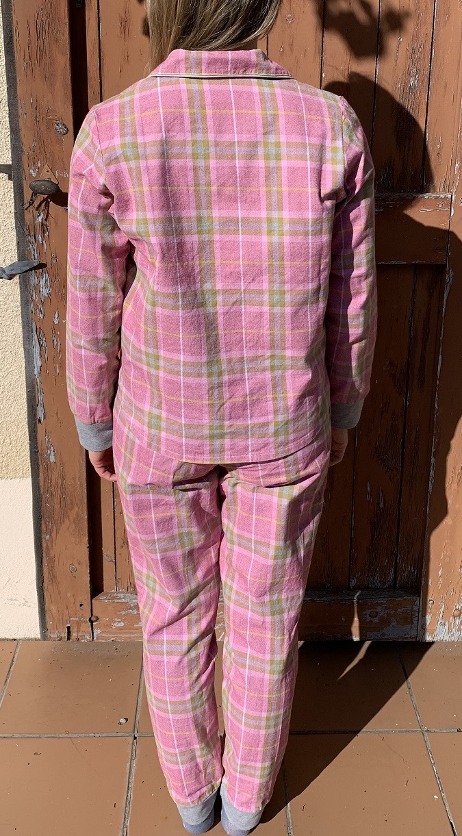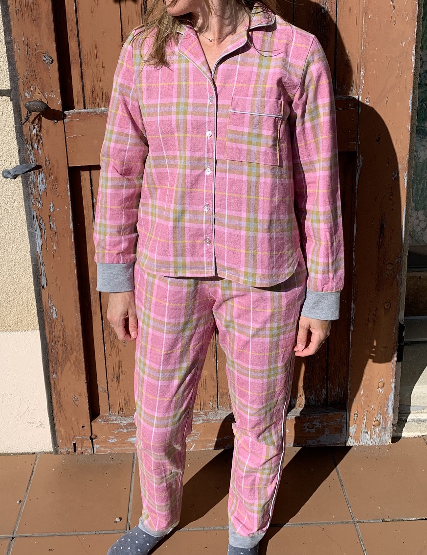 Je me suis ensuite attaquée au bas. Pour ma première version, j’avais utilisé le patron du pantalon de pyjama Février, issu du livre « ma garde robe à coudre pour toute l’année » de Charlotte Auzou. Malheureusement, il ne me convenait pas car la ceinture dos est trop basse pour moi. J’ai donc décidé d’utiliser le patron du short Prue de La Maison Victor 2/2019. Comme son nom l’indique, c’est un short et je l’ai donc rallongé directement sur le tissu.