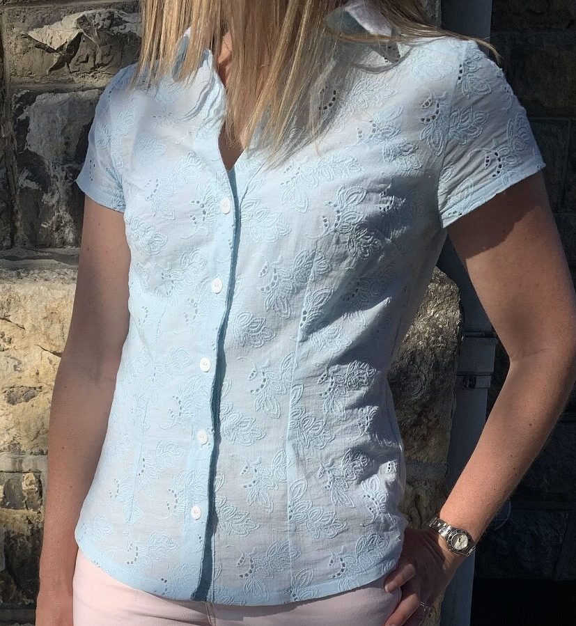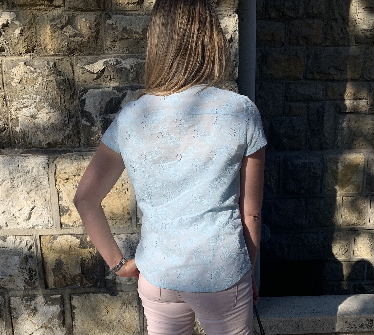 J’ai réalisé les deux chemises en taille 38. Je n’ai fait aucune modification pour la première version (broderie bleue). Pour la seconde version, j’ai légèrement élargi la taille (parce qu’il n’y a pas que les barbecues dans la vie, il y a les glaces aussi) et allongé de 5 mm la ligne d’épaule. Finalement ces modifications n’apportent pas grand chose et je reviendrai au modèle de base quand je ferai une troisième version. Quand je vous dis que le patron est parfait !