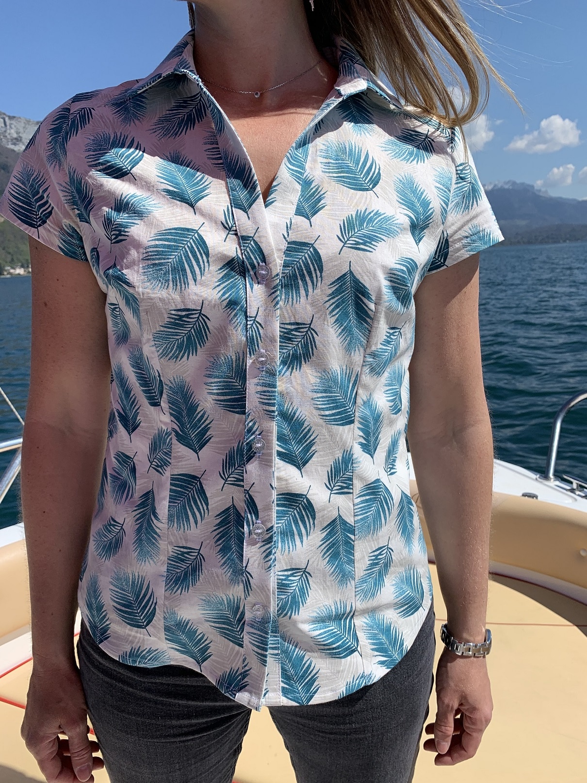 « Fit but you know it » est une petite chemise d’été à la forme idéale, manches courtes, pinces poitrines, col et pied de col, grand décolleté en V et empiècement dos. Voici le schéma technique :