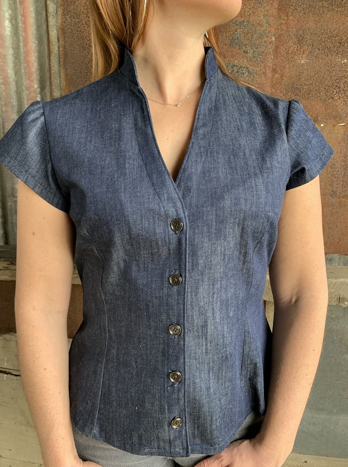 J’ai choisi de coudre la version E dans un jean de mon stock. D’abord parce que c’est une matière facile à travailler et aussi parce que c’est ce que je préfère porter. Malheureusement je n’ai pas fait d’ajustement et j’ai vite réalisé que j’aurais dû enlever au moins 2 cm entre l’épaule et la poitrine. J’ai donc coupé 2 cm aux épaules pour que le devant tombe parfaitement. Ce fut une grosse erreur de débutante car évidement, ça a modifié l’entournure et je me suis retrouvée à devoir faire des fronces aux manches pour que les emmanchures s’emboitent parfaitement. Et avec ce tissu un chouillat trop épais pour ce type de projet … Bref, vous imaginez le résultat…