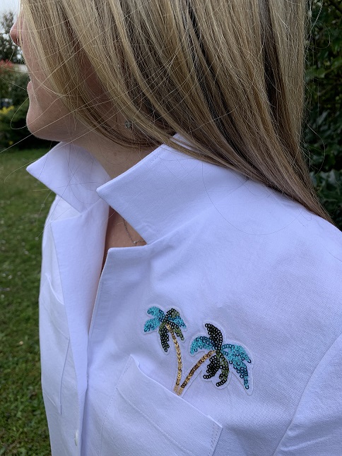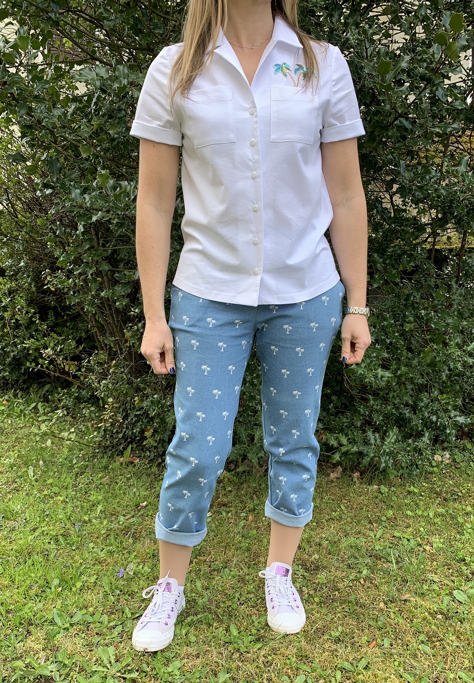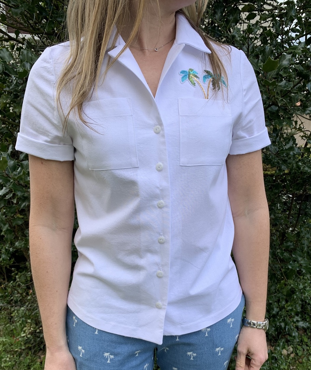 J’ai réalisé deux poches au lieu d’une proposée par le patron pour pallier à l’effet transparent du coton et ça fonctionne pas mal ! Côté bouton, j’ai choisi d’en poser 6 plutôt que 5 car ils sont assez petits et je ne voulais pas de bâillements intempestifs. Les manches sont un peu longues à mon goût mais je les porte roulotées, comme sur les photos, et là, je trouve que ça passe. Enfin, j’ai rajouté un petit motif thermocollant palmier que j’avais trouvé chez Sostrene Grene, j’espère qu’il tiendra le coup au lavage.