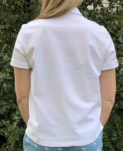J’avais envie d’un petit chemisier blanc pour aller avec mon pantacourt à palmiers. J’ai donc jeté mon dévolu sur le chemisier Bruna du magazine La Maison Victor de mars-avril 2018. Bruna est un chemisier de forme boxy, avec un joli col tailleur et des manches courtes. Il est d’un niveau de difficulté de 2 sur 4, c’est-à-dire pas trop compliqué. J’ai choisi de le réaliser dans un coton blanc tout simple.