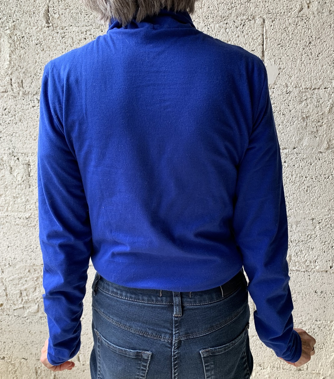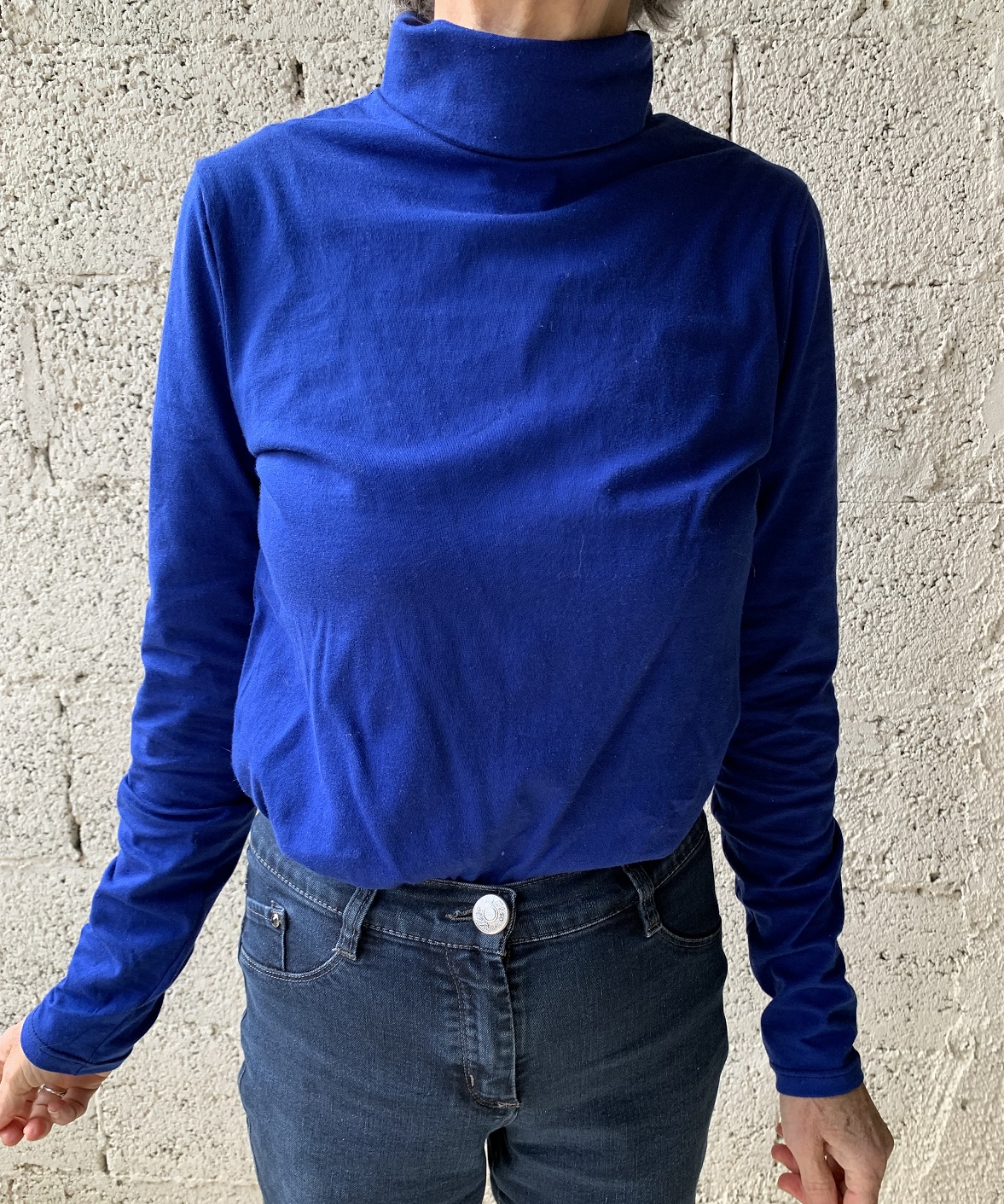 Pour une prochaine version, ma mère suggère de rallonger le col de 2 à 3 cm pour qu’il monte bien haut. Il faudrait également rétrécir de 4 cm le bas du col roulé pour qu’il plaque mieux au corps et fasse moins de plis une fois rentré.