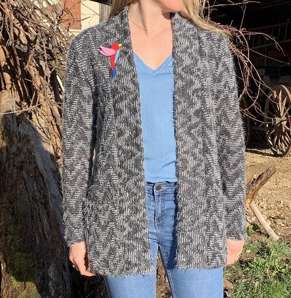 Admirez au passage la magnifique broche colibri réalisée en feutrine par Biquette !