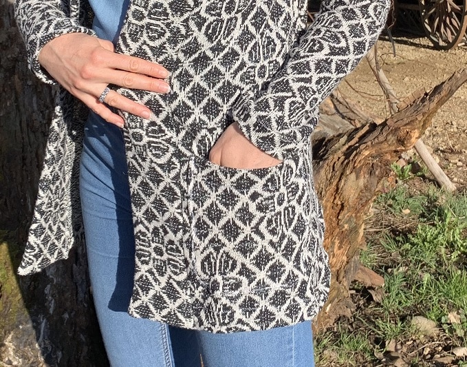 Bon, c’était tellement rapide que je suis restée sur ma faim. J’ai donc décidé d’ajouter des poches. Le patron est disponible gratuitement sur le blog de la créatrice avec un tuto vidéo. Je n’ai pas suivi les explications et j’ai choisi de coudre les poches à 5 cm de l’ourlet du bas et à 1 cm du col.