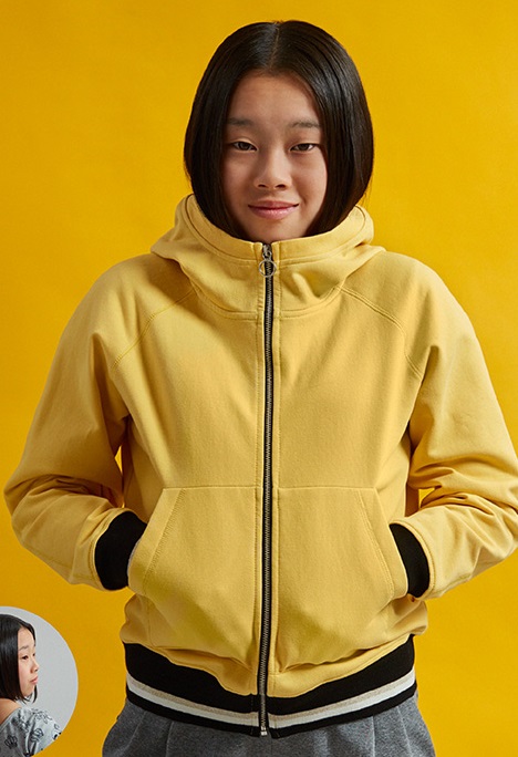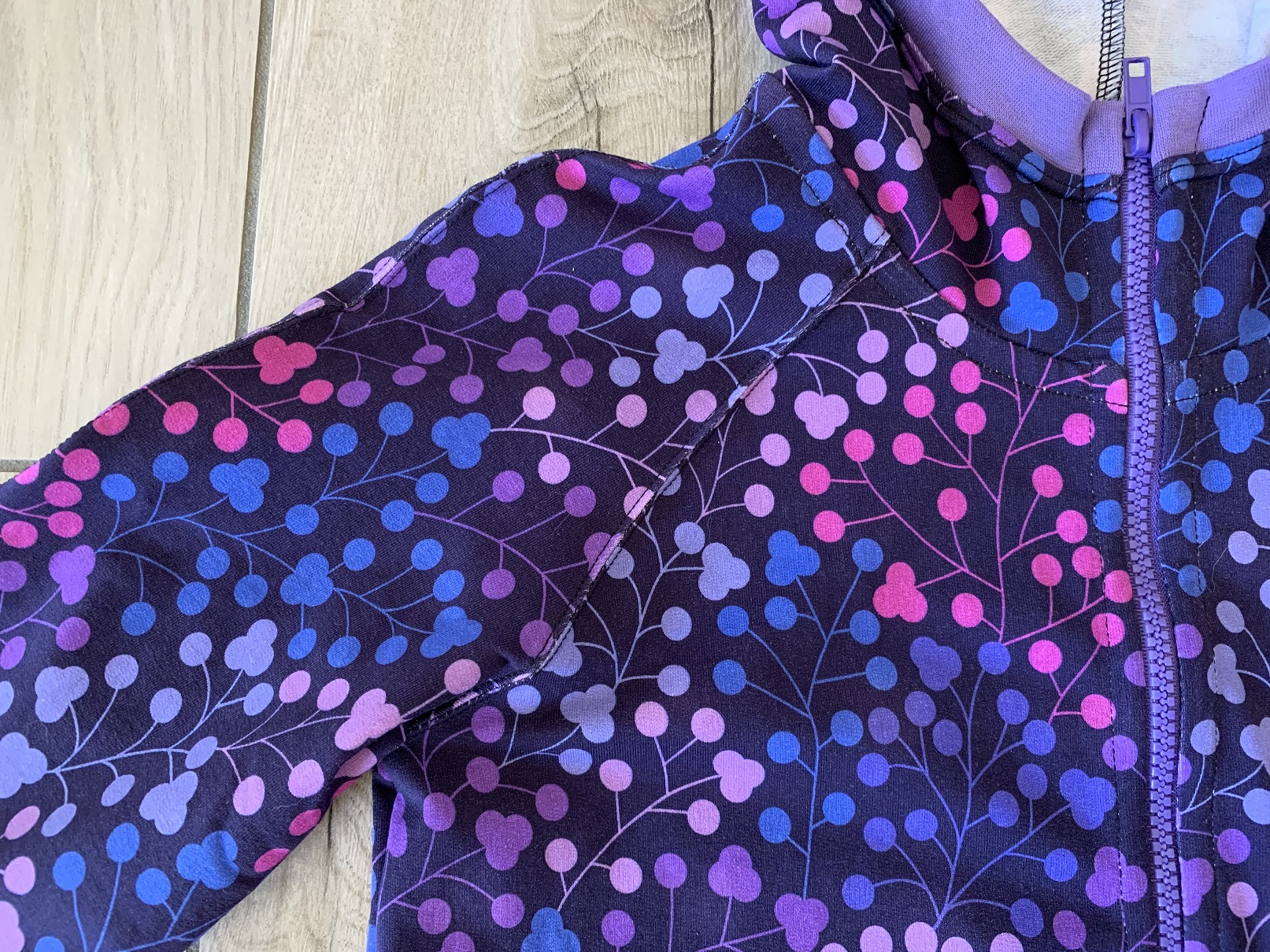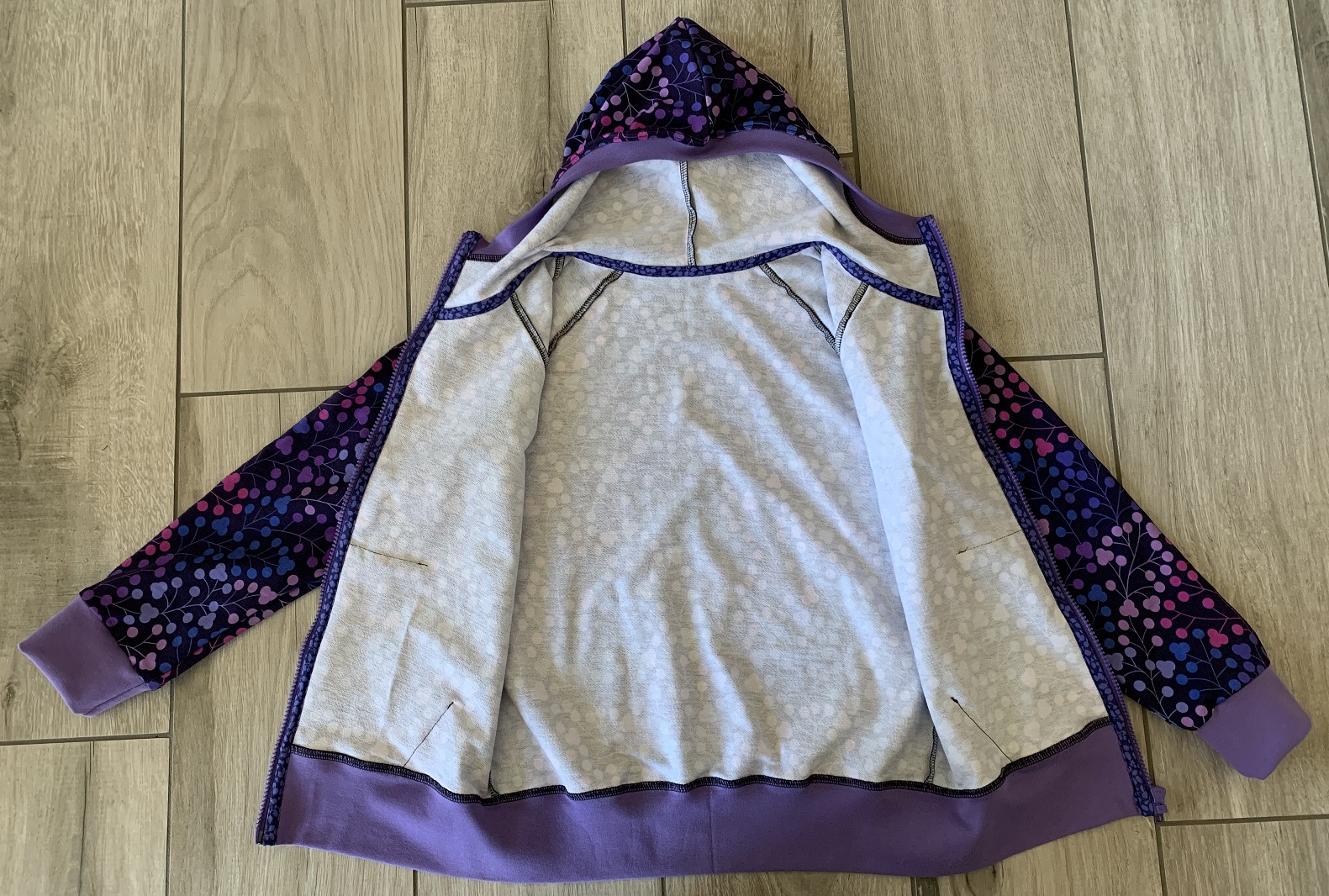 Je n’ai pas rencontré de difficulté pour coudre ce gilet. J’ai toutefois trouvé son montage un peu long car il faut surpiquer de partout et ganser le bord du zip ainsi que la couture de l’assemblage de la capuche au corps. Mais cela en valait la peine, voici ma réalisation en taille 140 cm :