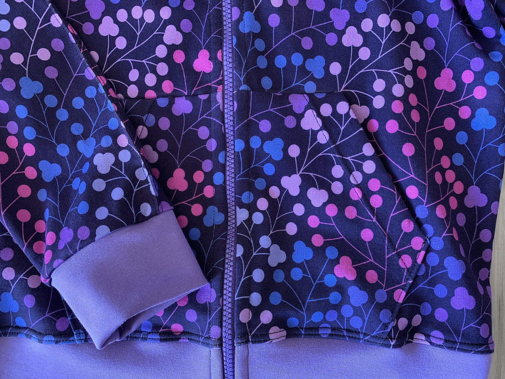 Pour enlever le zip, il suffit de poser la pièce devant au pli en enlevant les marges de couture. Quant au col, pas besoin de le retracer, j’ai simplement posé un bord-côte et c’est tout. Le tissu à flocons vient aussi de chez Glitzerpueppi, c’est également un French terry que j’ai associé avec un French terry noir tout simple pour les manches. Quel bonheur de coudre des tissus de cette qualité !