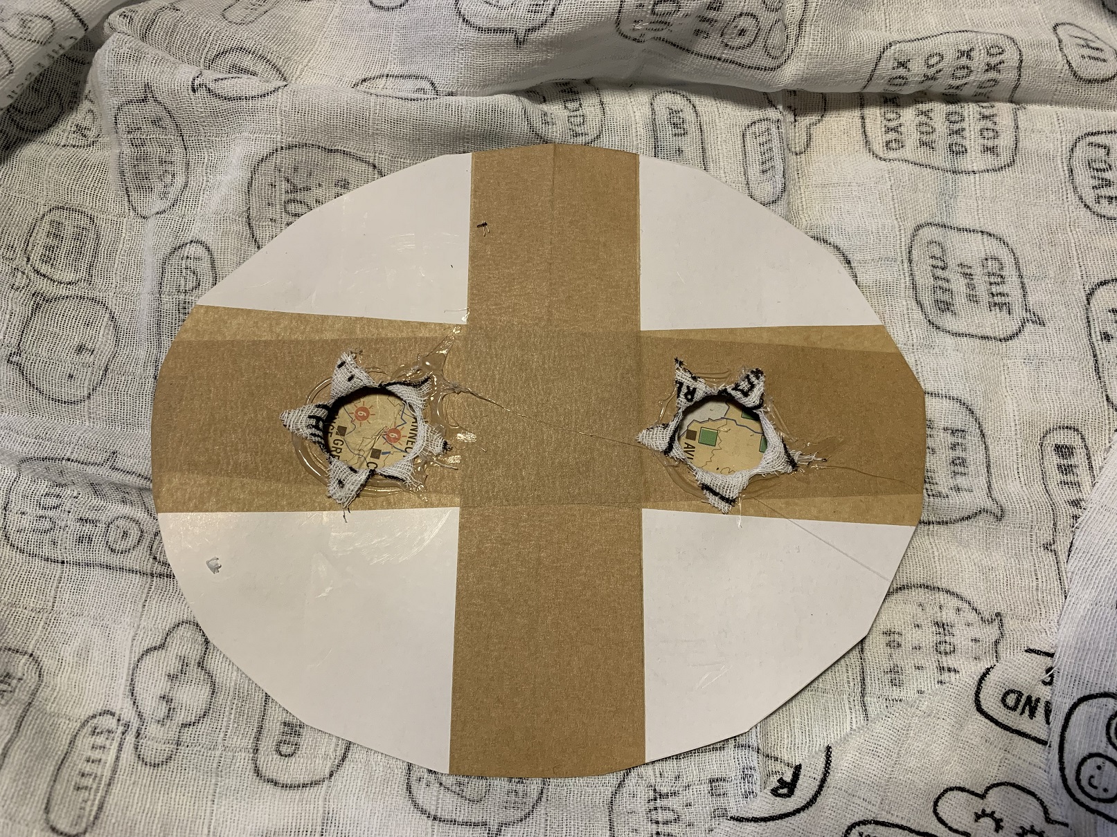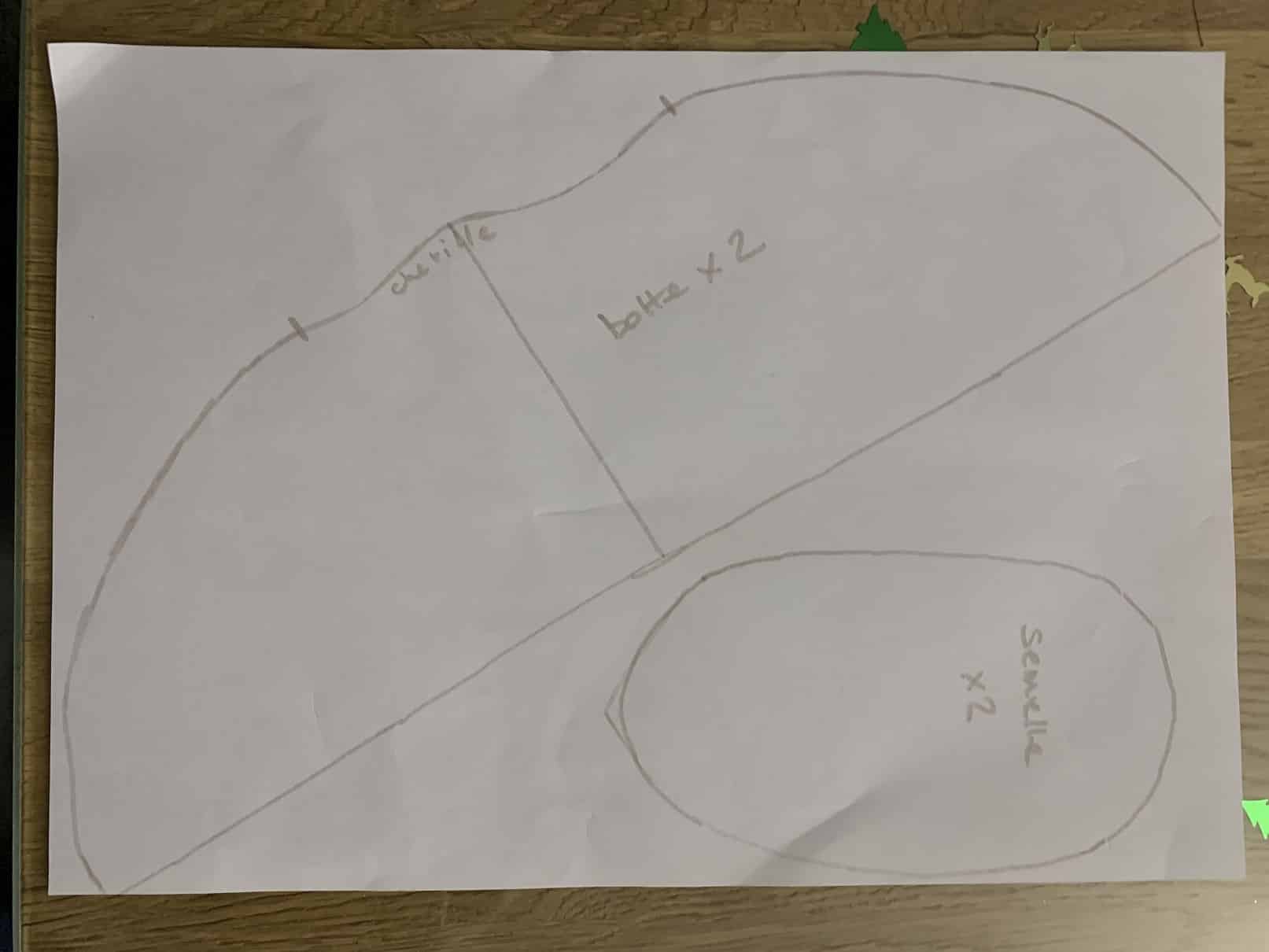 L’étape suivante est la création du fond de culotte. Je l’ai dessiné au pif sur le même carton que pour les semelles et j’ai percé deux trous pour faire passer les jambes. Le mien mesure environ 25 cm de large mais vous faite bien les dimensions que vous voulez.