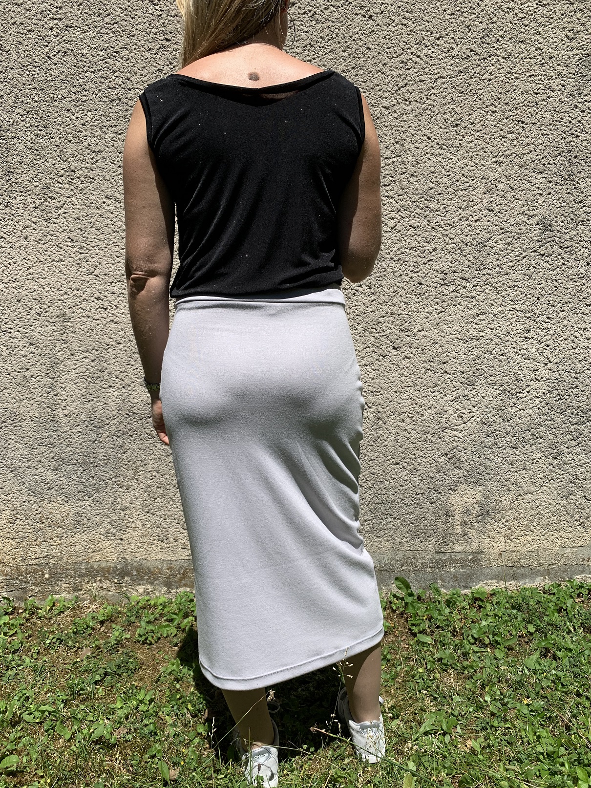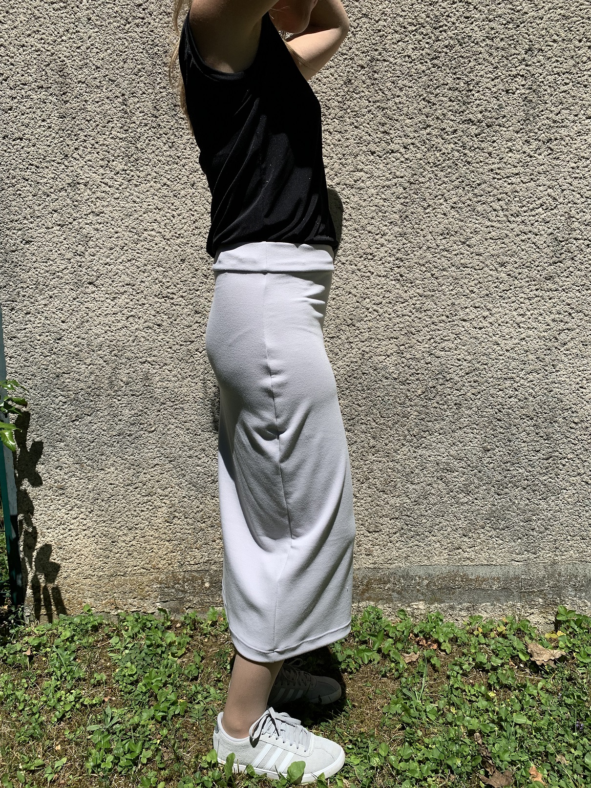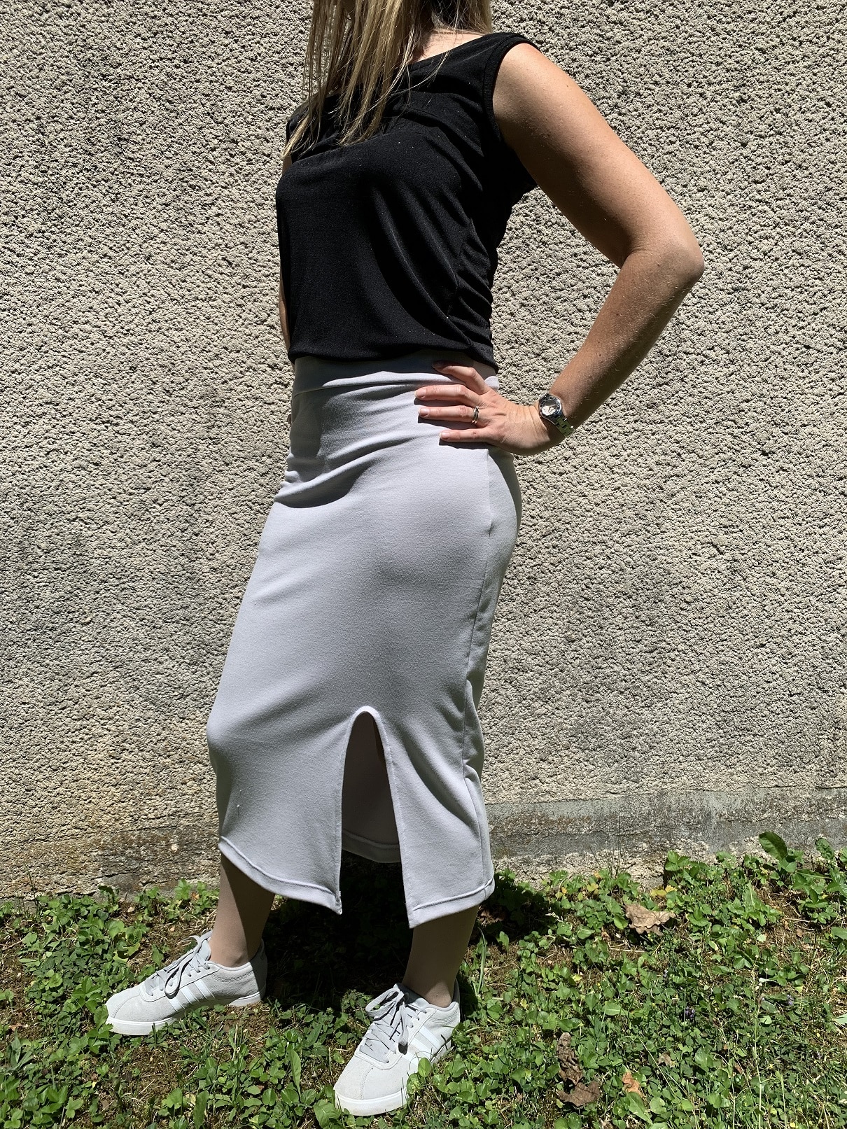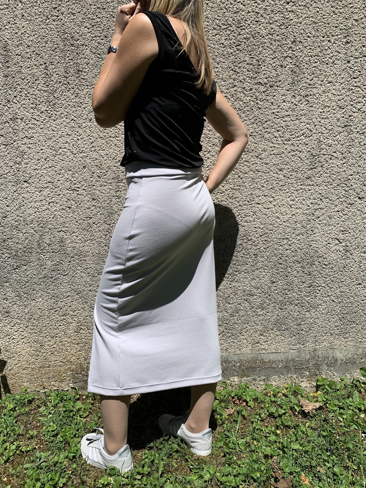 Je n’ai pas l’habitude de porter des jupes de cette longueur mais je suis malgré tout satisfaite du résultat. Si je devais en coudre une nouvelle version, je pense que je raccourcirai encore de 5 cm sur la partie haute de la jupe, histoire de remonter un peu plus la fente.