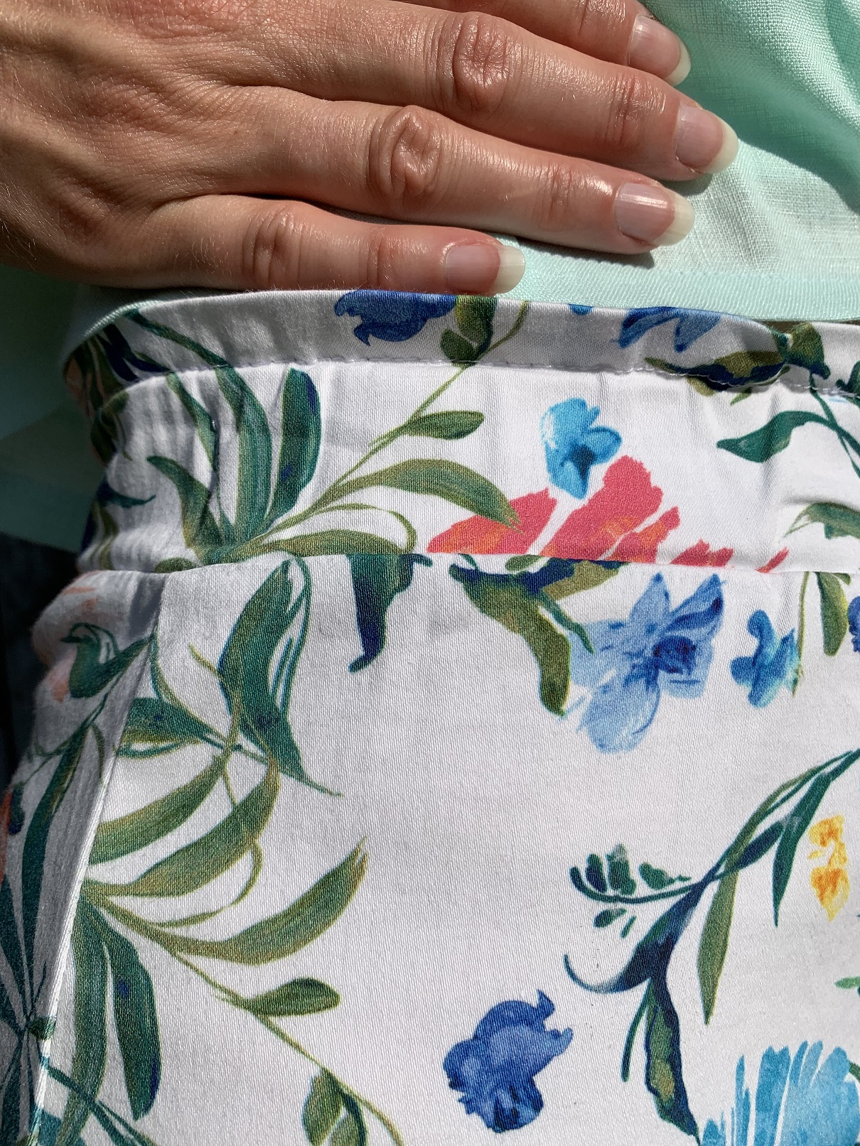 Pour ma première version, j’ai utilisé un jean extensible imprimé fleufleur des Coupons de St Pierre. La ceinture est un simple rectangle de 12 cm de large (repliée en deux et avec les marges de couture on arrive à une hauteur de ceinture de 5 cm). Pour obtenir la longueur, on mesure le tour de taille et on multiplie par 0.8 voire 0.9 si le tissu est peu élastique. Je n’ai pas eu besoin d’insérer d’élastique dans la ceinture.