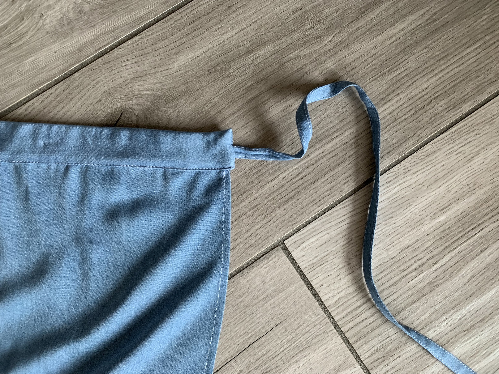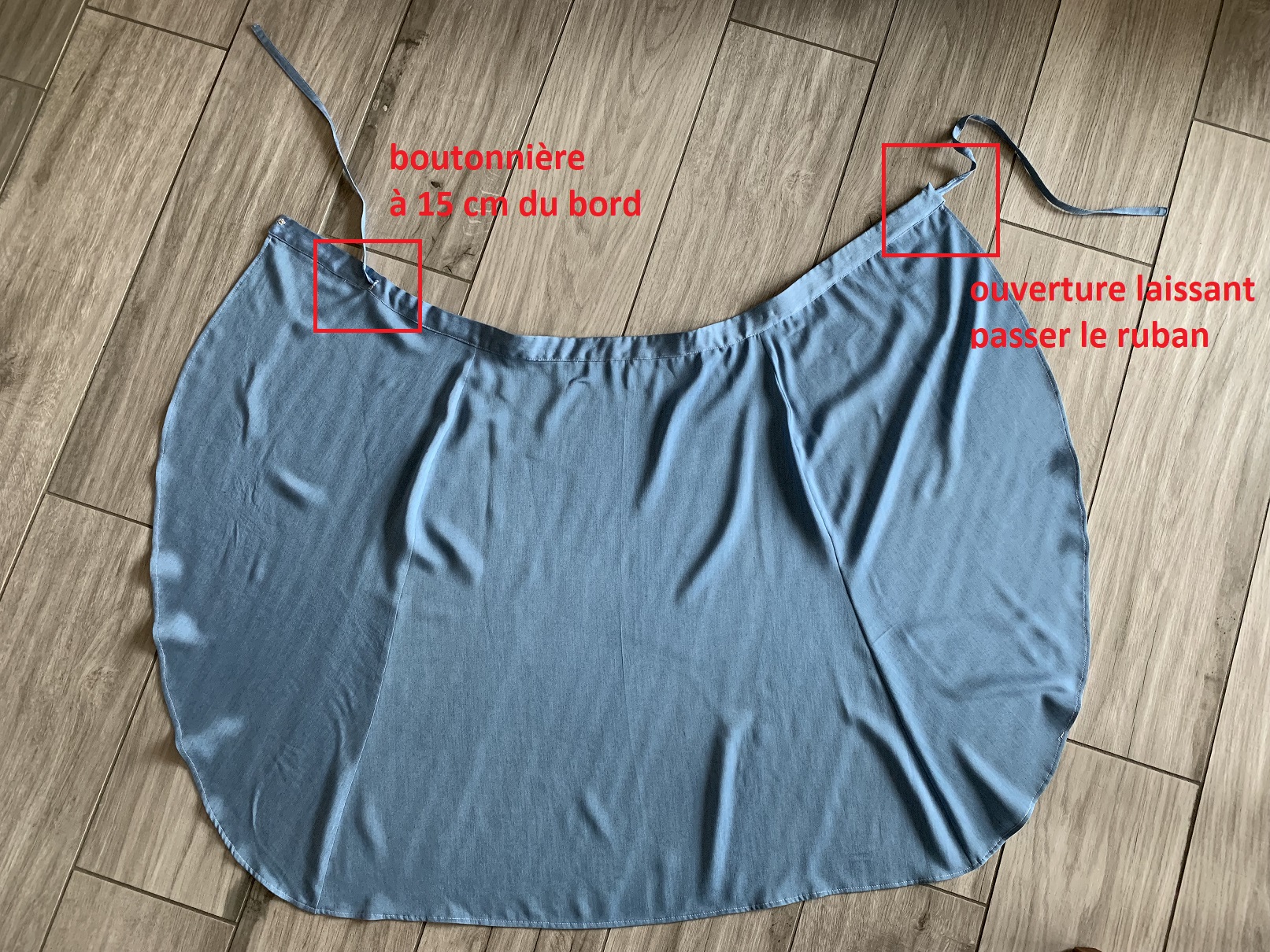 Pour réaliser ma jupe j’ai procédé de la façon suivante : j’ai cousu les pans entre eux (les deux devants et le dos) et j’ai fait tout de suite un ourlet fin, de la largeur d’un surjet. Ensuite j’ai réalisé les deux rubans à nouer (des rectangles de tissu que l’on replie à la façon d’un biais) et je les ai cousus à chaque extrémité un élastique coupé un peu plus court que mon tour de taille. J’ai fait un repère sur la ceinture pour voir où l’un des rubans allait passer (côté gauche) et j’ai donc fait une boutonnière à cet endroit-là. Puis j’ai posé la ceinture à la façon d’un biais là aussi et j’ai inséré l’élastique cousu avec les rubans. Il faut bien sûr laisser également une ouverture côté droit de la ceinture pour laisser passer l’autre bout du ruban.