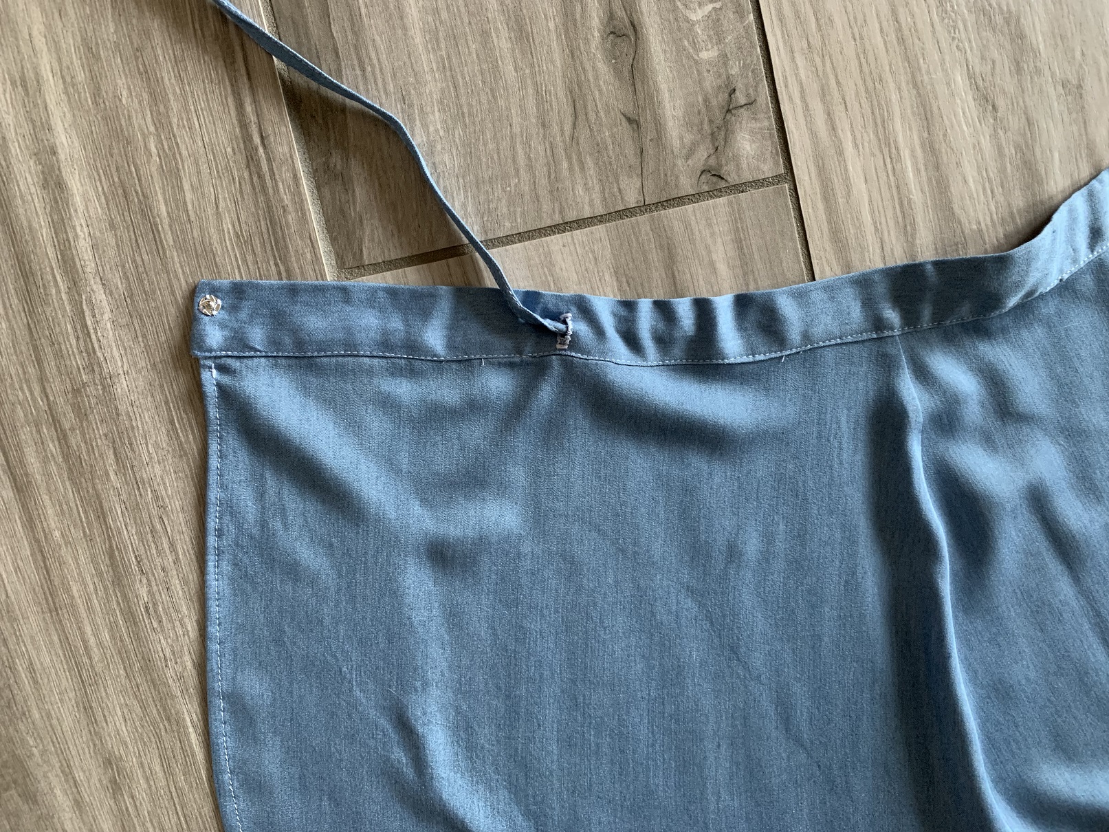 J’ai laissé 15 cm entre le bord gauche de la ceinture et la boutonnière et j’ai cousu une pression pour maintenir ces 15 cm en place une fois la jupe portée. Côté droit j’ai laissé une ouverture classique et je n’ai pas surpiqué. Les deux rubans qui « sortent » de la ceinture sont cousus à un élastique pour plus de confort, technique que j’ai glanée sur le blog de Sandrine de SB Créations que je vous recommande chaudement.