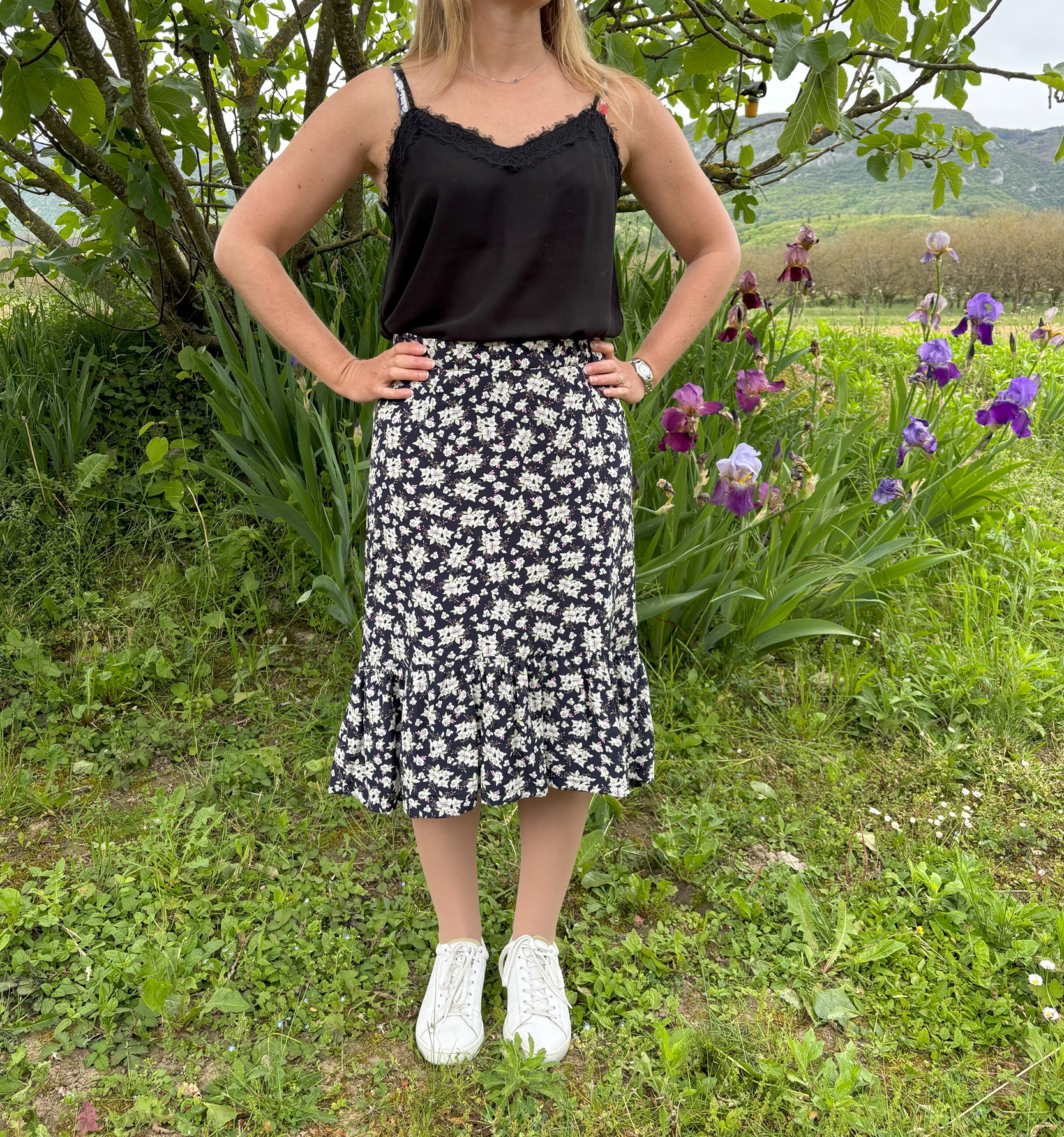 La jupe Nancy est une jupe asymétrique avec un large volant en bas et une fermeture invisible dans le dos. Elle se coud en chaîne et trame et j’ai choisi de la réaliser dans une viscose de chez Driessen Stoffen.