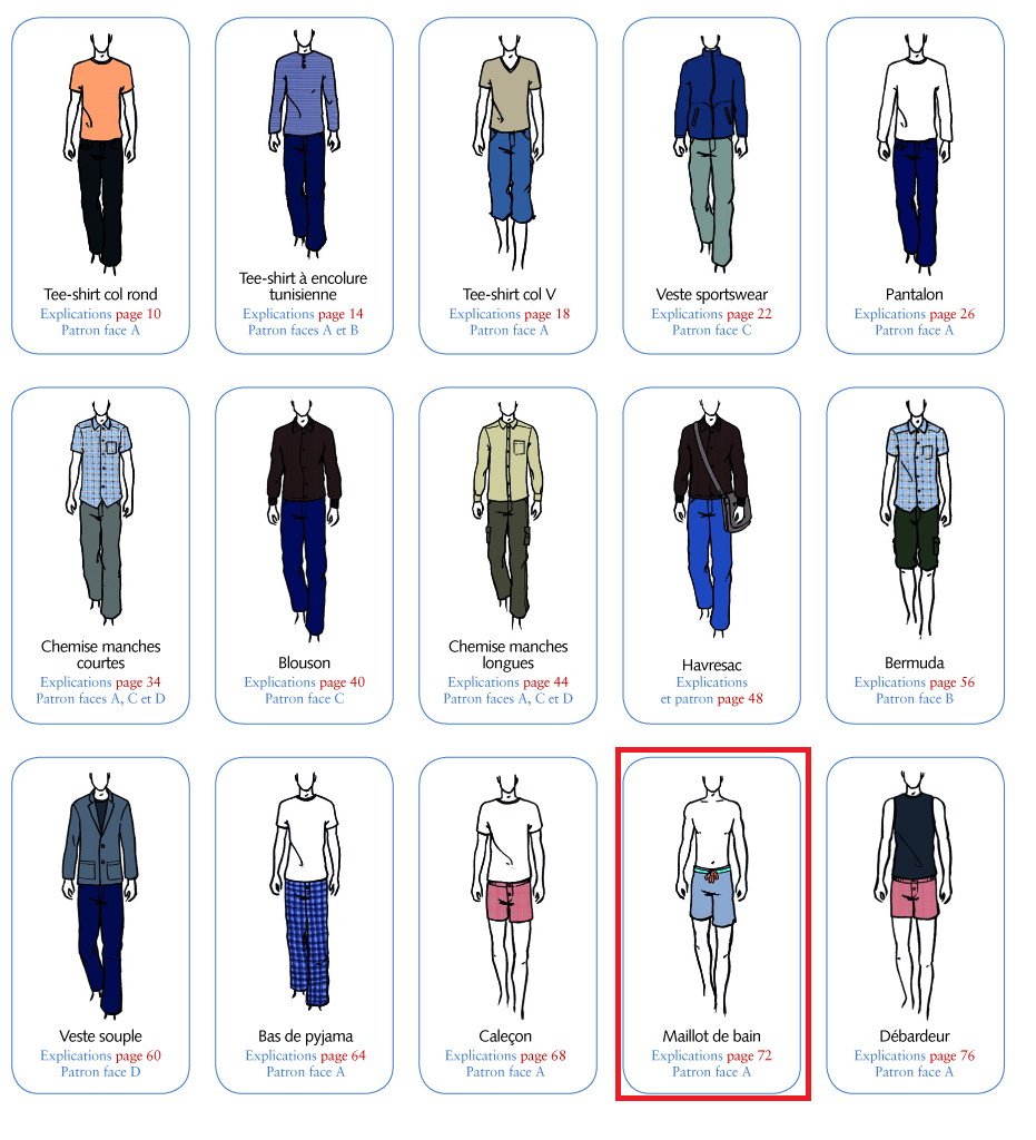 J’ai utilisé le patron du maillot de bain disponible dans le livre « Casual Wear Homme » de Christelle Beneytout :