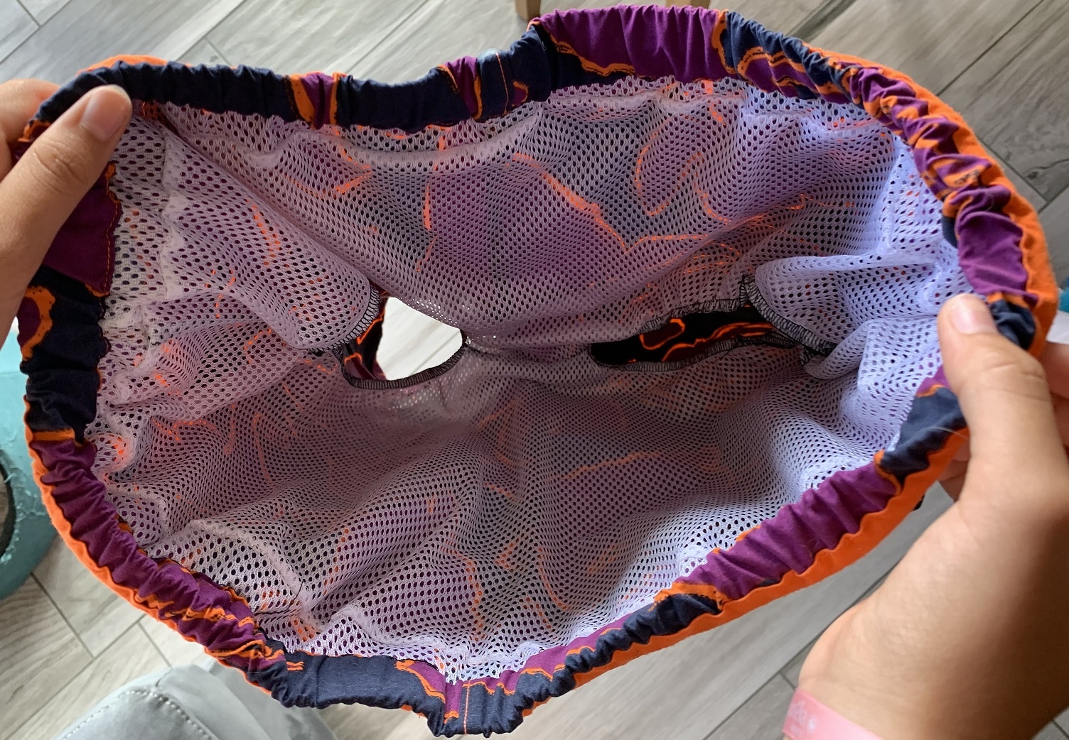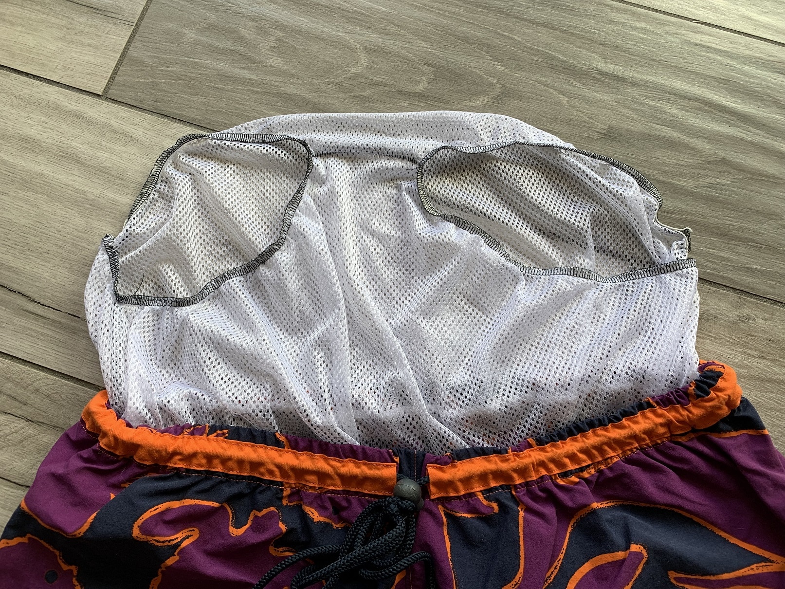 Par contre, pour le filet à boulettes, j’ai un peu plus galéré. J’ai voulu reproduire celui d’un autre maillot de bain de monsieur qui lui allait parfaitement mais ça n’a pas fonctionné. Ici j’ai dû y aller en tâtonnant, heureusement que monsieur télétravaille et qu’il pouvait faire des essayages réguliers ! J’ai donc coupé tant bien que mal un devant et un dos que j’ai assemblés par l’entrejambe et sur les côtés. J’ai ensuite cousu des élastiques autour des cuisses, directement à la surjeteuse et j’ai donc grossièrement obtenu un slip. Puis j’ai fixé le tout au haut du maillot avant de rabattre la ceinture où on insère l’élastique. Et là, cata : le matos était maintenu trop haut ! J’ai donc fait chauffer le découd-vite (beuuuuurk) puis j’ai allongé le slip en lui rajoutant une bande à la taille, coupée dans mes tous derniers cms, et là, miracle, tout était maintenu au bon endroit, tout en étant confortable, méga ouf de soulagement ! Je vous laisse admirer la chose, chic, glam et tout et tout :