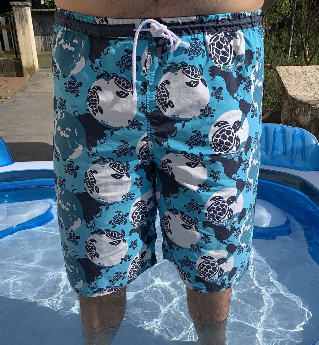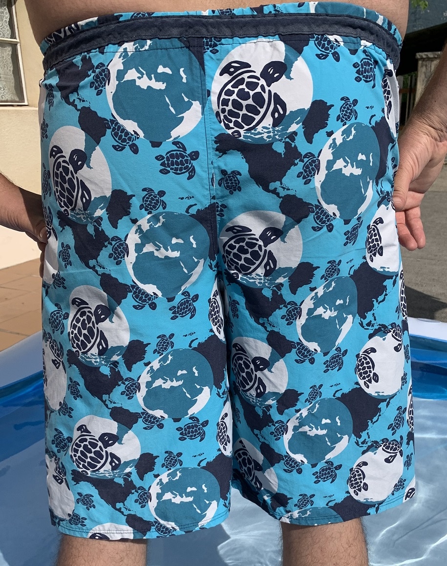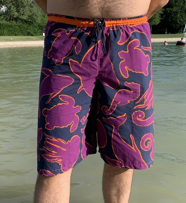 Edit 15/10/2025 : Voici ma 3e version de ce maillot de bain qui décidément convient bien à Chéri. J’ai refait toutes les modifications que j’avais apportées au 2e et le résultat est impeccable. Le tissu provient de nouveau de chez Indigotex et j’ai trouvé de quoi faire le soutien-baloches chez la mercerie Sudocoud. Il s’agit d’un tissu destiné à réaliser les doublure de culotte et ça fonctionne très bien ici.