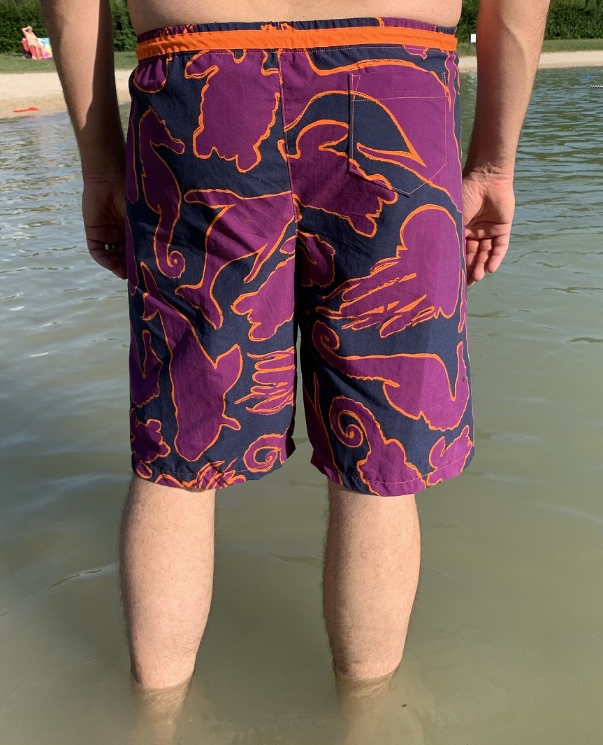 Pour celui-ci, monsieur avait quelques réclamations : il voulait une poche dos et un soutien-balloches à l’intérieur. Bon, pour la poche dos, je ne suis pas allée chercher bien loin, j’ai utilisé le patron de poche du bermuda, disponible dans le même livre. J’ai rajouté du velcro pour que la poche reste fermée même dans l’eau et j’ai bien fait attention aux raccords, qui sont presque parfaits :
