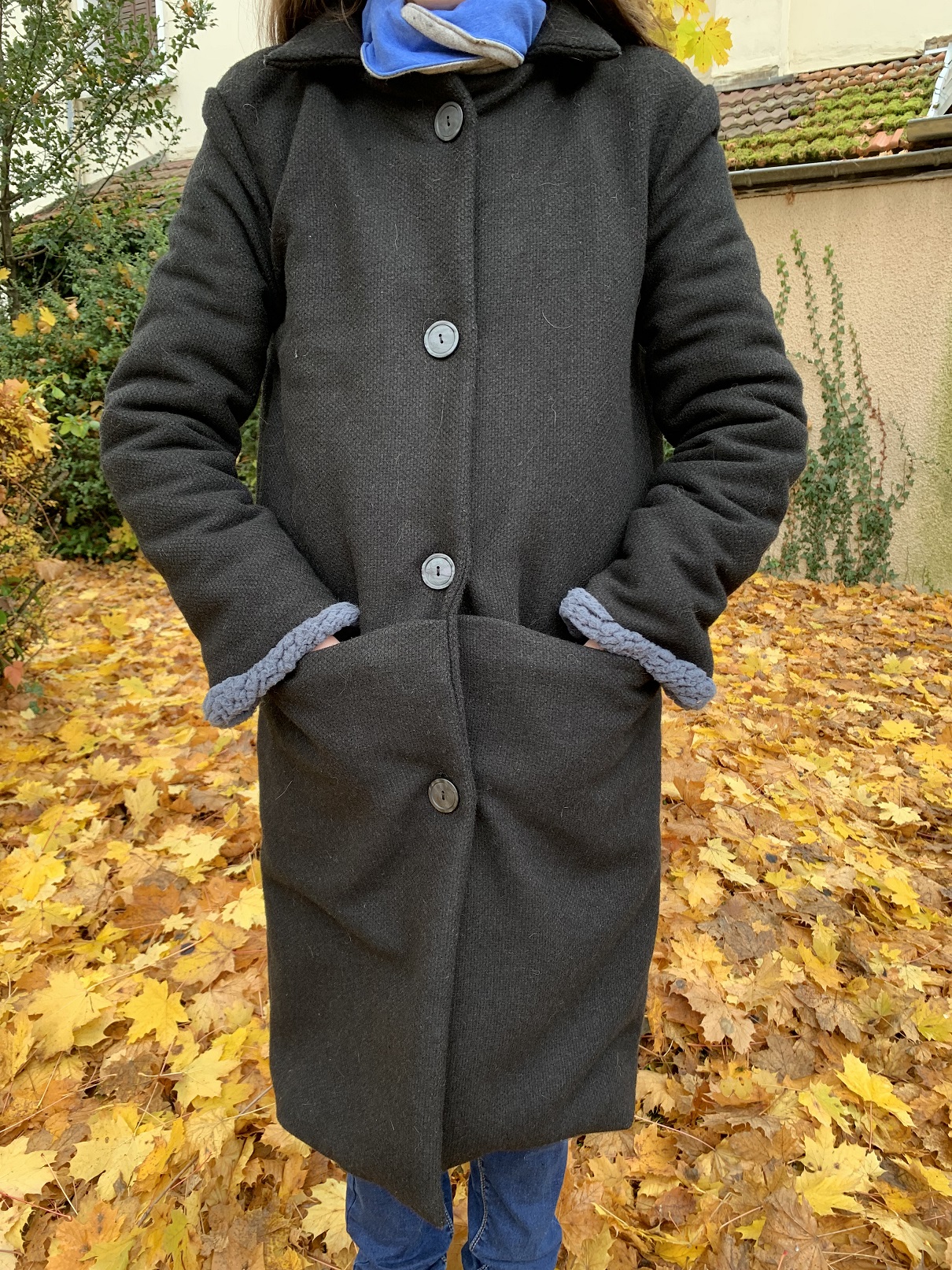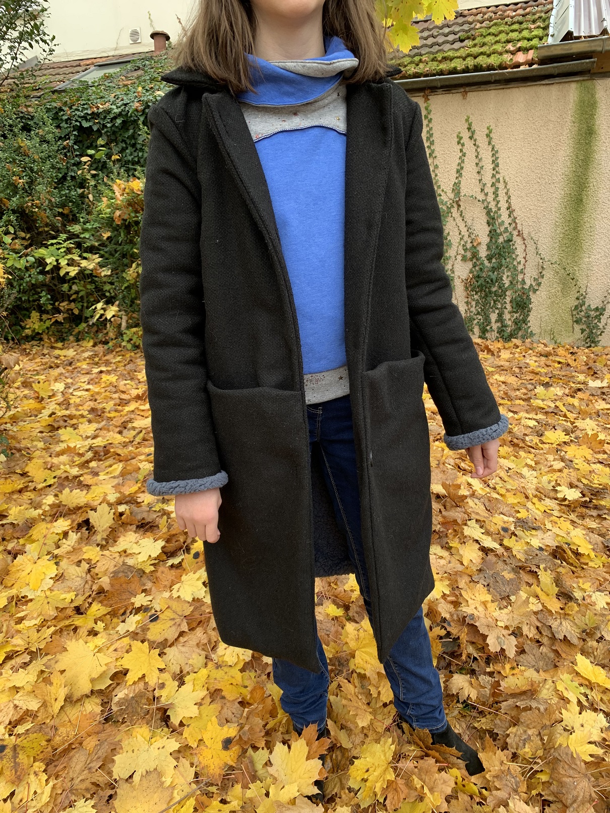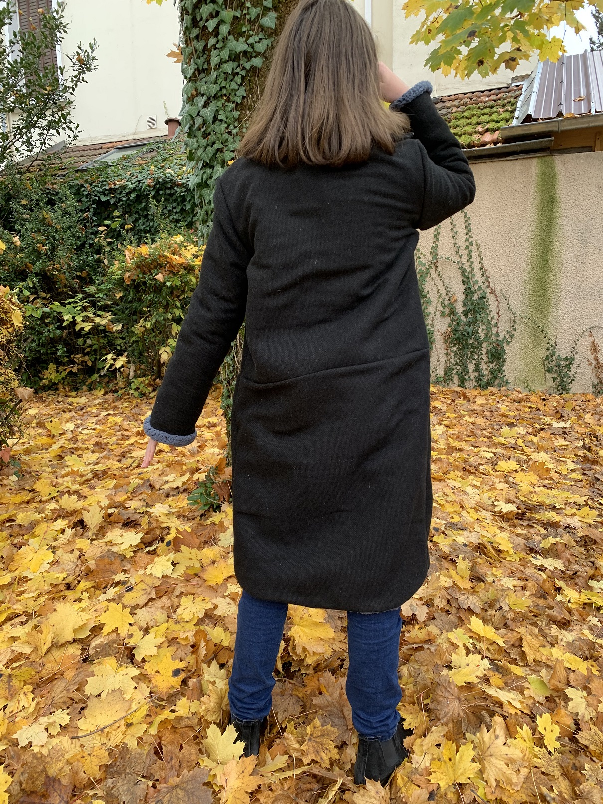 Je suis contente du résultat, le manteau est confortable et la doublure se marie bien avec le lainage. Par contre, je trouve qu’il me tasse un peu, et c’est bien fait pour moi parce qu’une fois de plus, je n’ai pas fait les modifications de stature : j’aurais dû le raccourcir d’au moins 5 cm dans la hauteur. Sa coupe loose me plaît bien aussi mais je vais peut-être essayer de coudre une ceinture pour réduire un petit peu l’ampleur. On verra plus tard, pour l’instant, je m’attaque au manteau de Biquette.