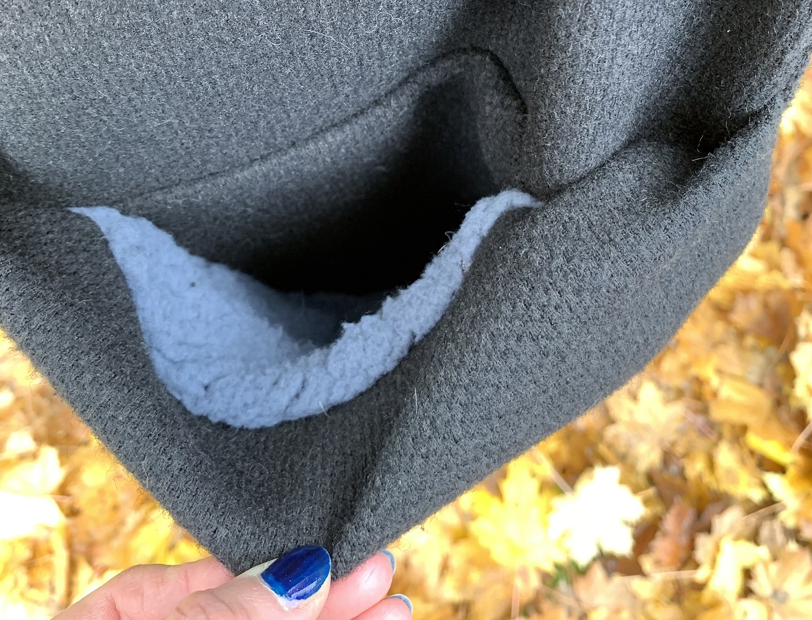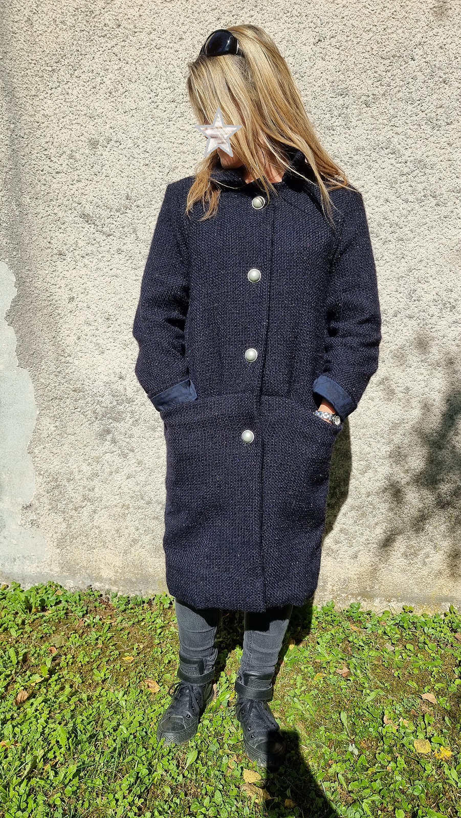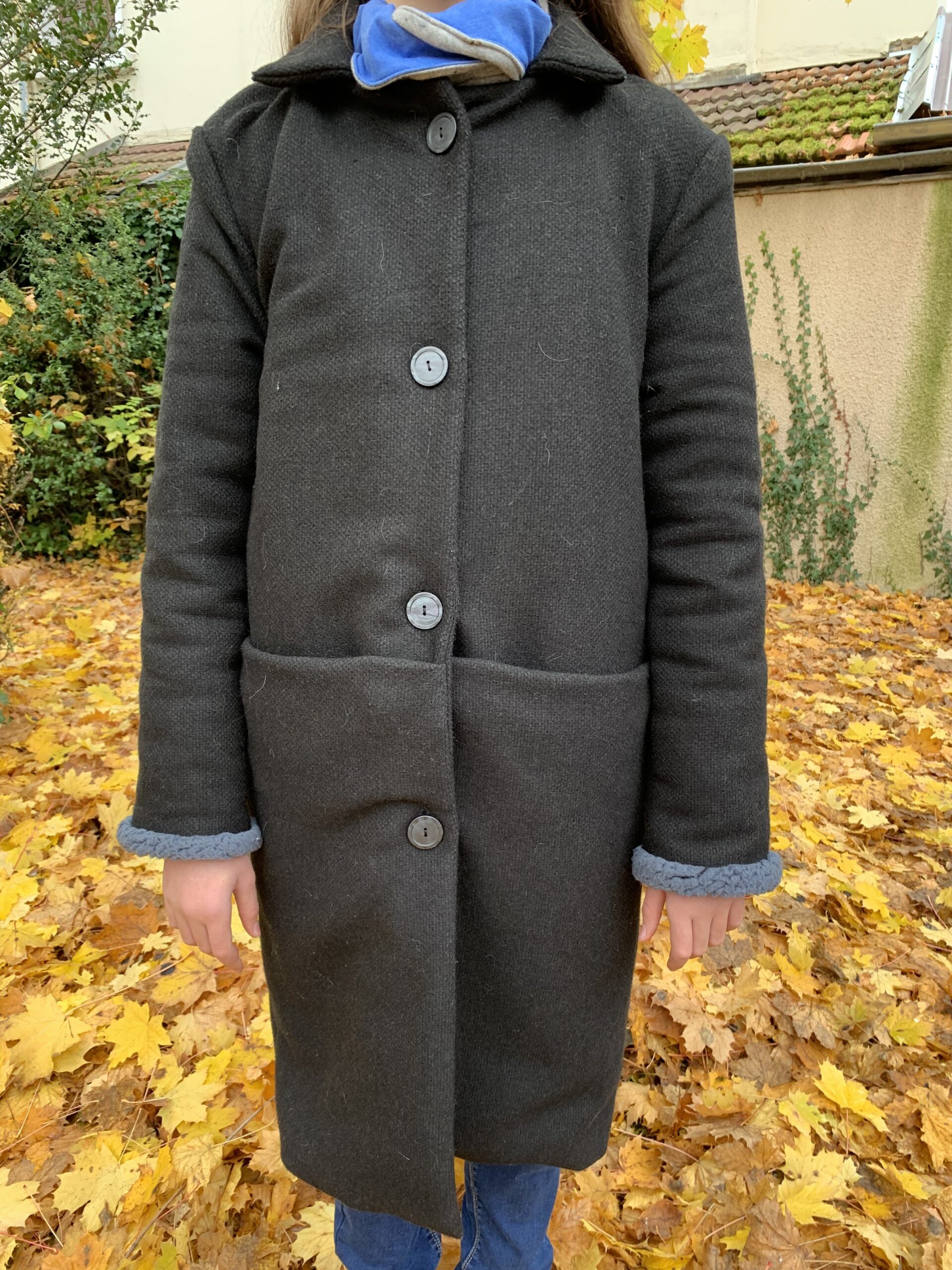Je suis contente du résultat, le manteau est confortable et la doublure se marie bien avec le lainage. Par contre, je trouve qu’il me tasse un peu, et c’est bien fait pour moi parce qu’une fois de plus, je n’ai pas fait les modifications de stature : j’aurais dû le raccourcir d’au moins 5 cm dans la hauteur. Sa coupe loose me plaît bien aussi mais je vais peut-être essayer de coudre une ceinture pour réduire un petit peu l’ampleur. On verra plus tard, pour l’instant, je m’attaque au manteau de Biquette.