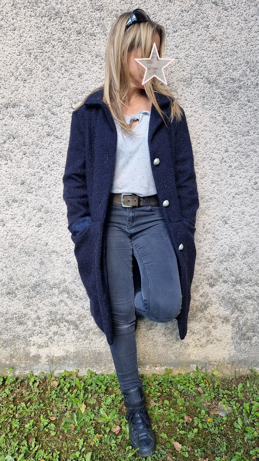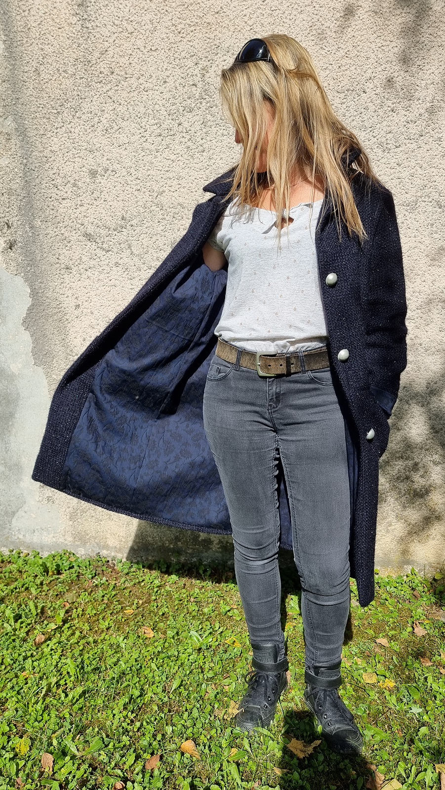 En coupant les pièces j’ai réalisé que le manteau n’allait pas être très chaud parce que le lainage était un peu fin. J’ai donc décidé d’essayer de patronner moi-même une doublure et je ne m’en suis pas trop mal sortie, la chance du débutant en doublure probablement ! J’ai choisi un tissu de mon stock, un jean brodé que j’avais utilisé cet été pour me coudre une jupe crayon. J’ai cousu ce manteau en quelques jours et j’avais vraiment hâte de pouvoir le tester/porter.