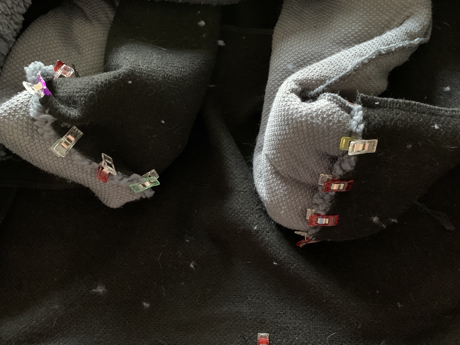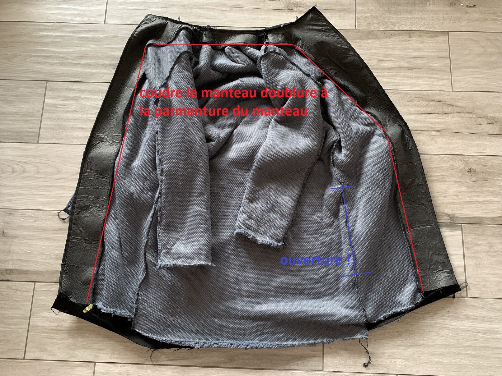 Une fois que les deux manteaux sont montés (extérieur et doublure), on vient les coudre ensemble endroit contre endroit.