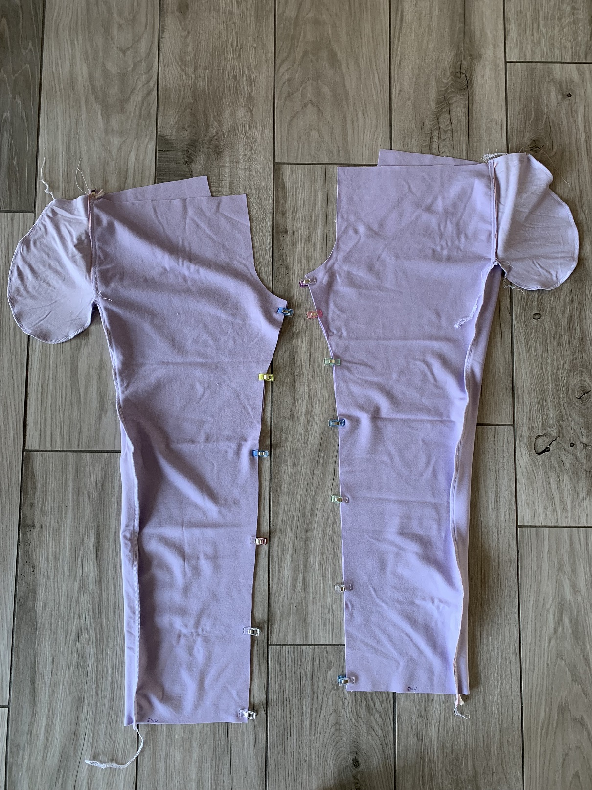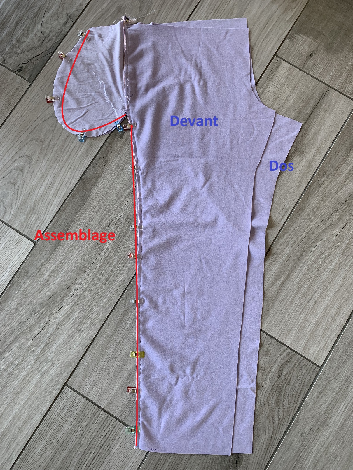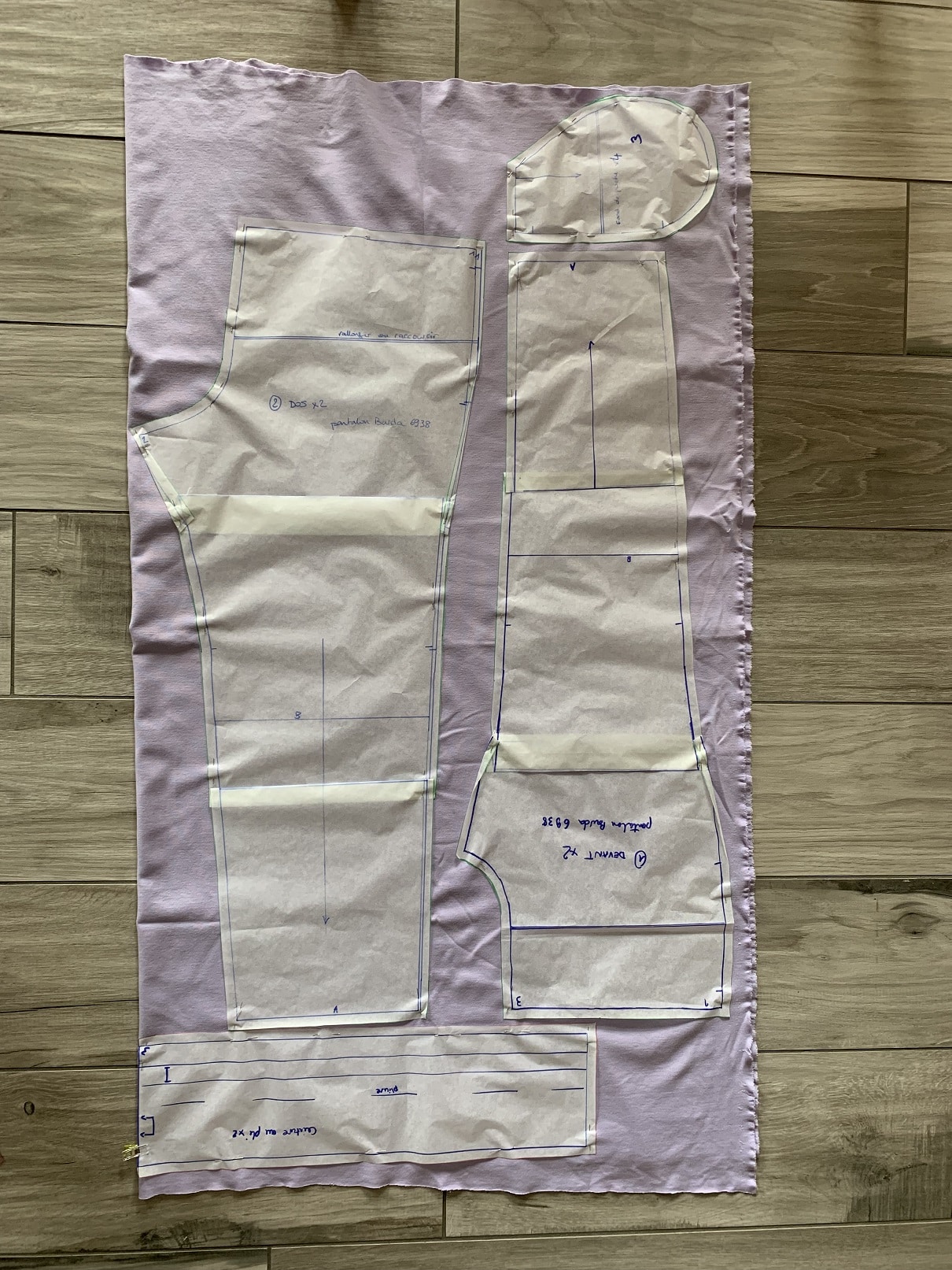 J’ai utilisé un jersey milano de chez Bennytex ainsi qu’un bord-côte de mon stock. Le patron ne prévoit pas de bord-côte mais j’ai préféré en utiliser pour terminer les jambes. Je n’avais qu’1m20 de ce jersey mais j’ai réussi à faire rentrer toutes les pièces en taille 38. J’ai coupé 2 des 4 fonds de poches dans une chute de tissu plus fin pour ne pas créer de sur-épaisseur. J’ai retouché le patron en le raccourcissant.