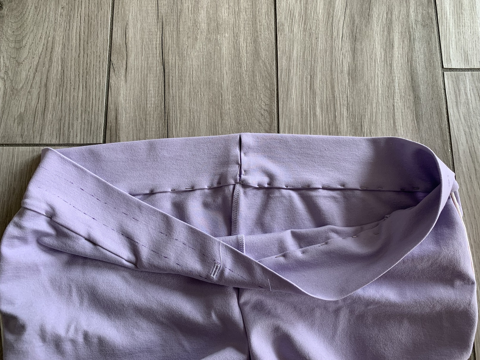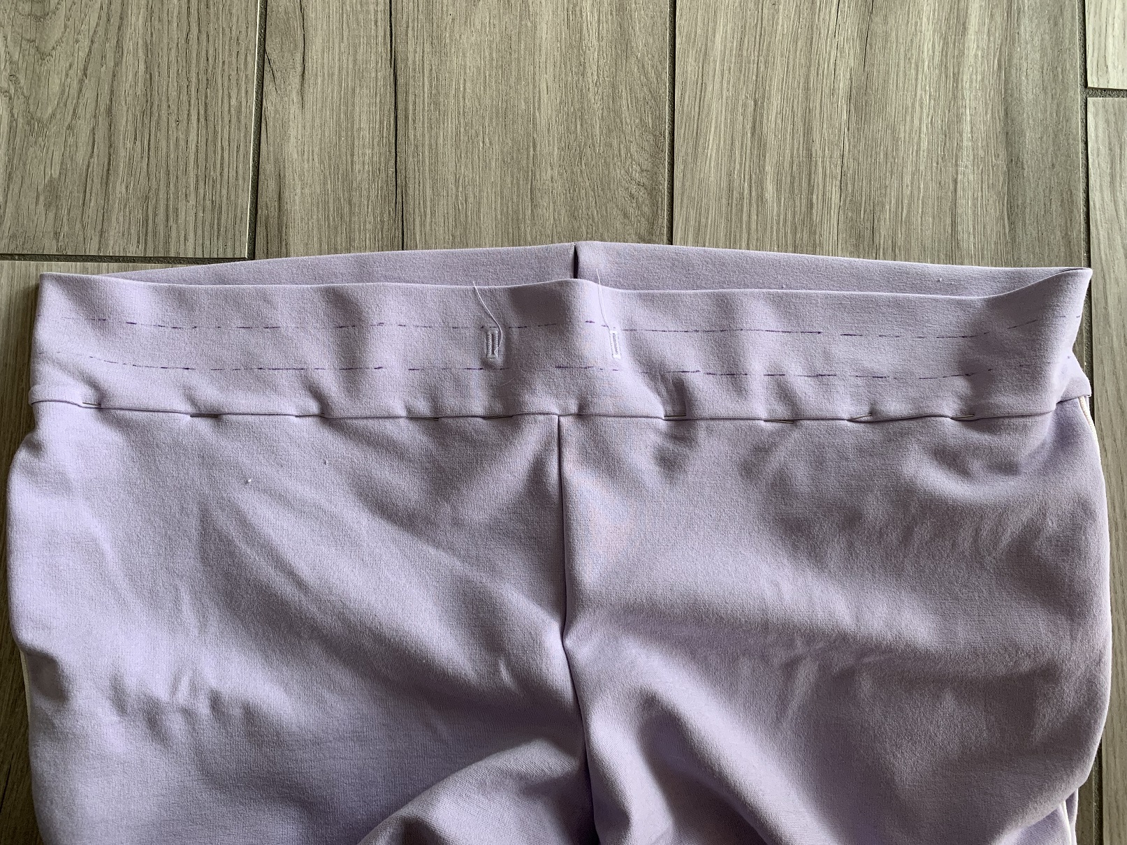 Là, ça commence à ressembler à un pantalon ! J’ai suivi les indications du patron concernant la bande de taille pour placer mes boutonnières correctement. Du coup j’ai également suivi ces indications pour créer 3 coulisses (2 pour les élastiques et 1 pour le cordon) mais si je refais ce patron , je ne ferai qu’une bande de taille simple où le cordon et l’élastique épais sont dans une seule et même coulisse.