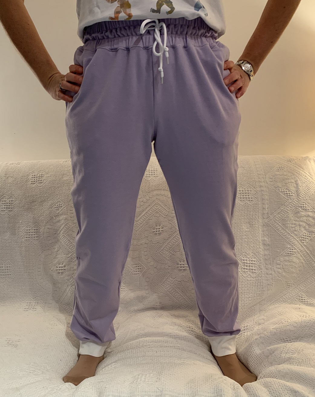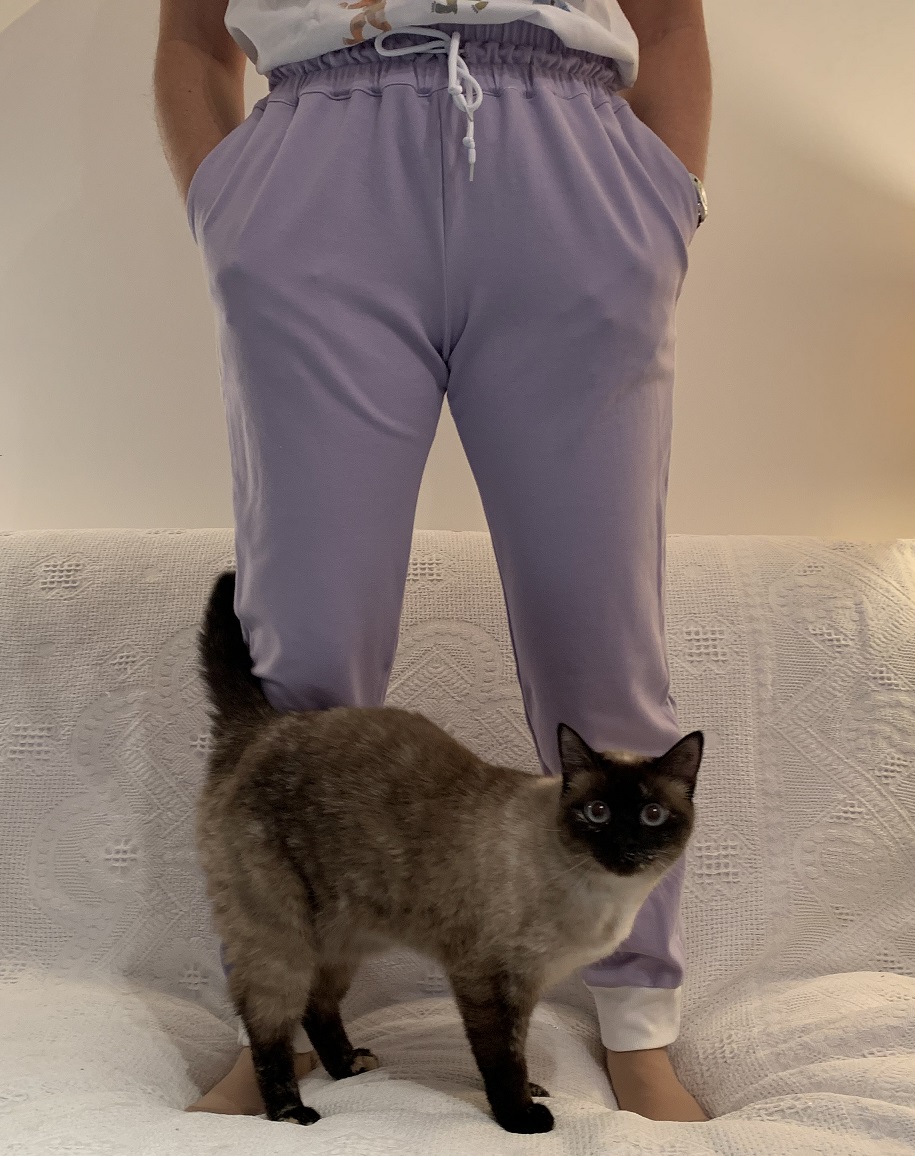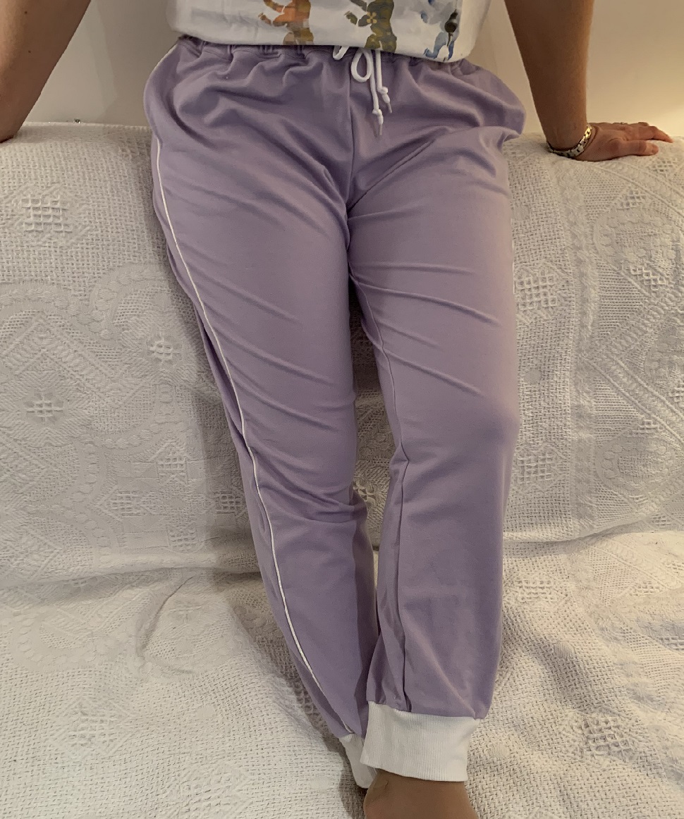 J’aime beaucoup ce petit pantalon, il est hyper confortable et tombe plutôt bien. Je le referai peut-être en version « jour » et dans ces cas-là, il faudra que j’allonge les jambes pour ne pas mettre de bord-cote. Je ferai peut-être une taille en dessous pour qu’il soit plus près du corps.