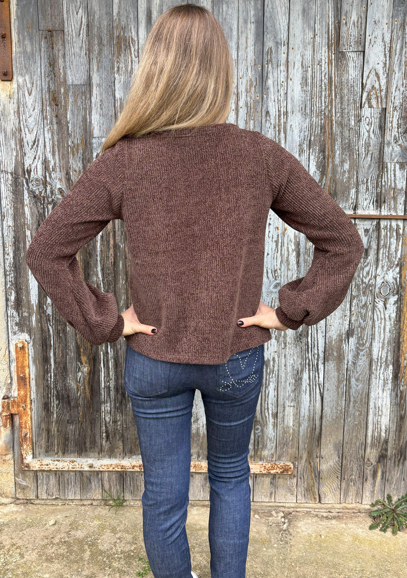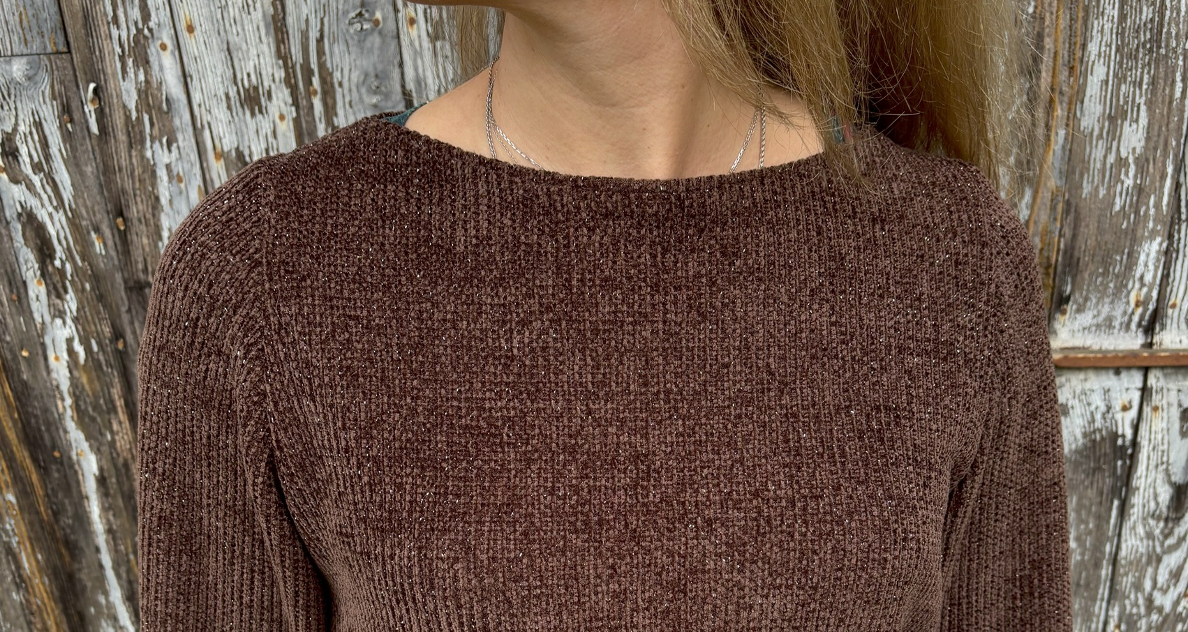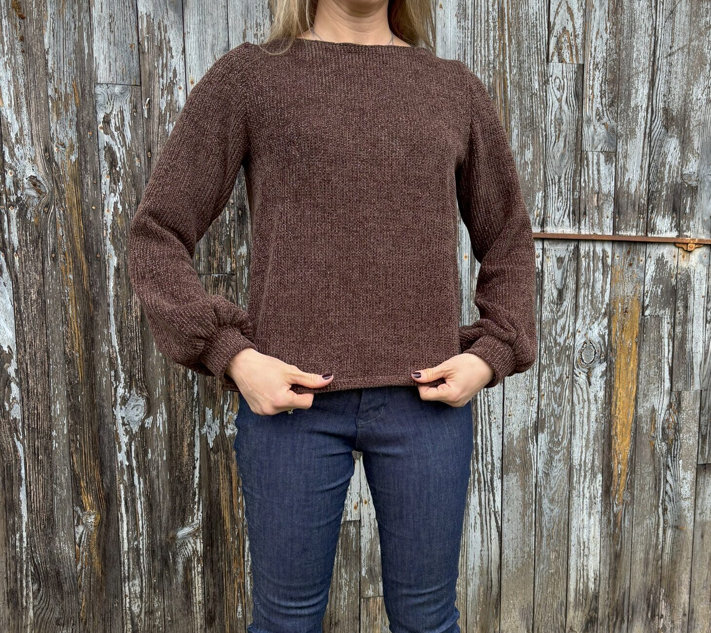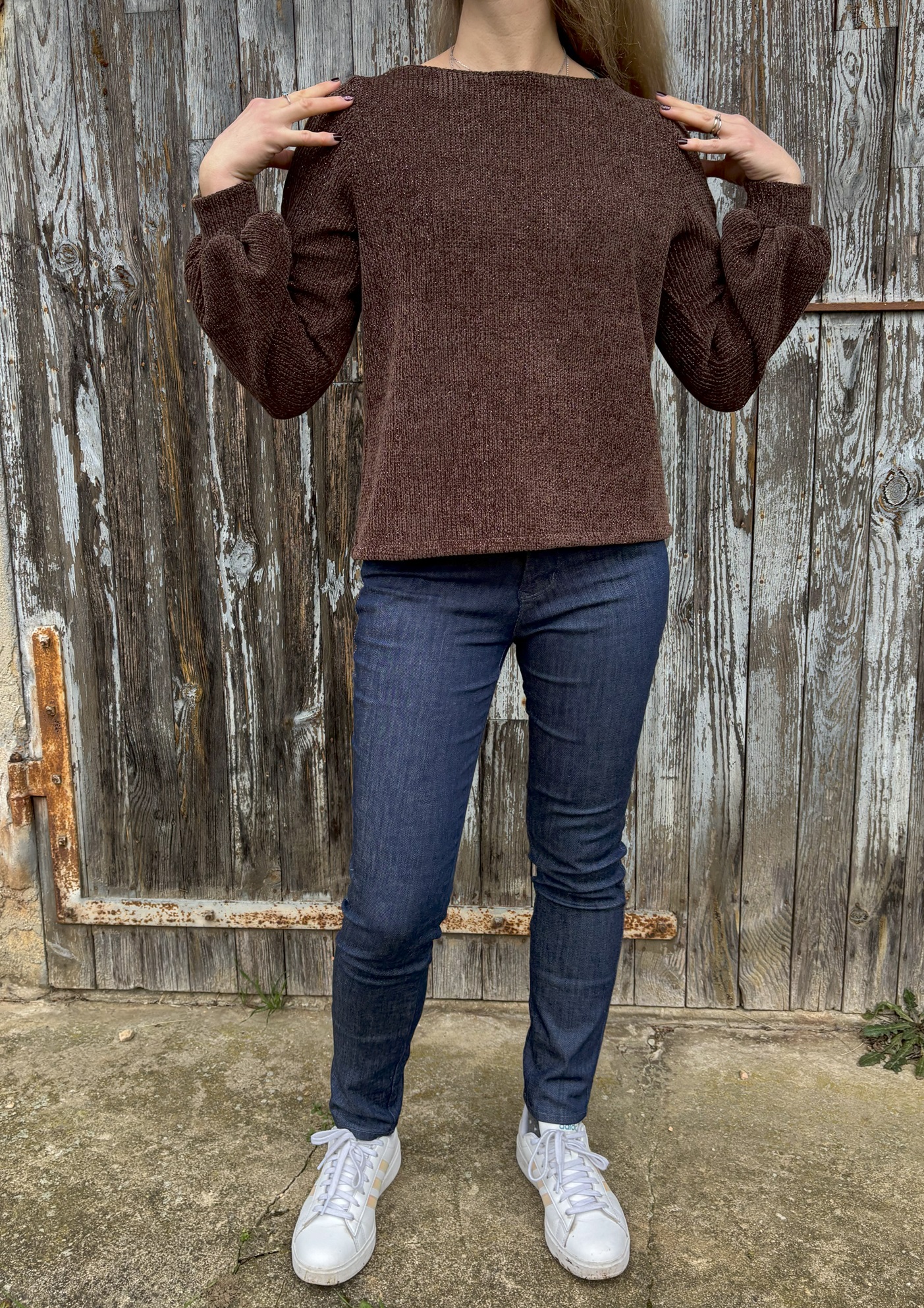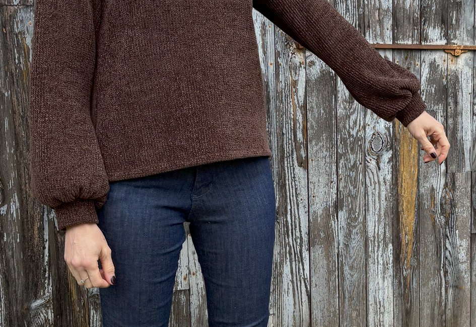 Le pull Arya est, selon Majam, : « un patron élégant et cocoon à la fois ! L’encolure bateau et ses jolies manches lui donnent le côté élégant, et la coupe ample apporte le côté confortable à porter au quotidien ». Je dois dire que je suis bien d’accord. Ce sont les manches bishop qui m’ont d’abord attirée, puis j’ai vu le col bateau, simple mais élégant. J’ai donc choisi une maille qui dormait dans mon stock et j’ai coupé une taille 36.