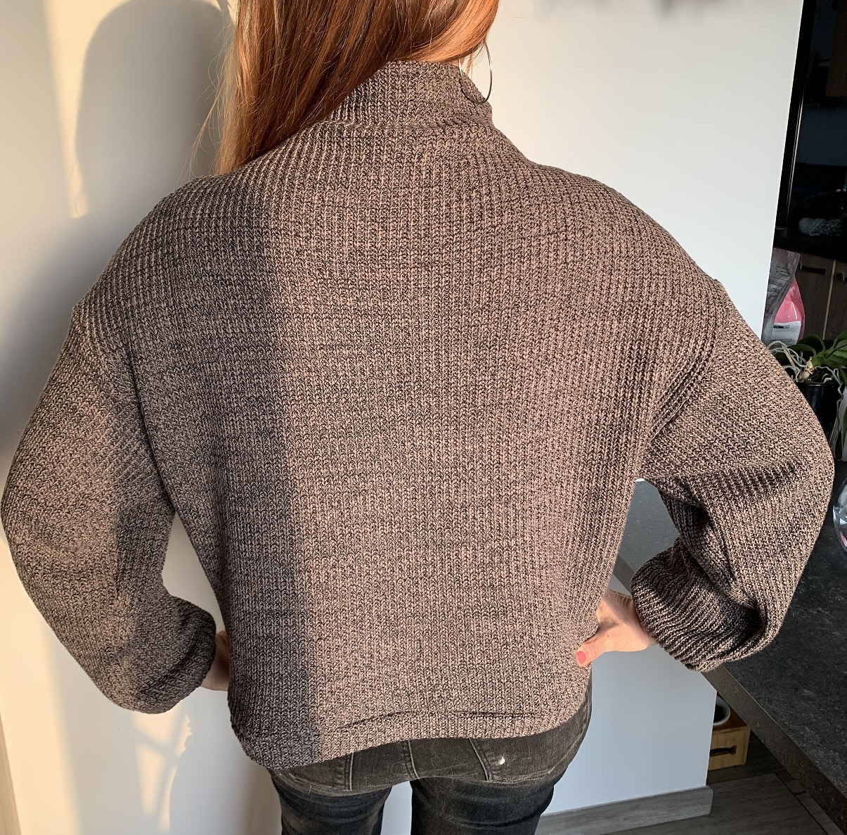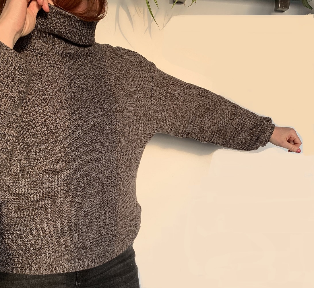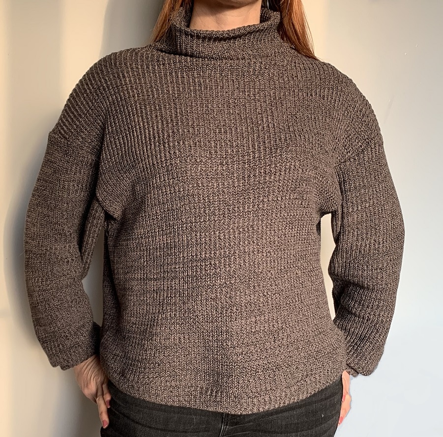 J’ai choisi de le coudre en taille 38 et j’aurais dû couper plutôt un 36 car le pull était trop grand, notamment les manches que j’ai dû raccourcir. Je n’ai pas suivi les explications pour les poignets et la bande de taille que j’ai fait à ma façon, comme d’habitude.
