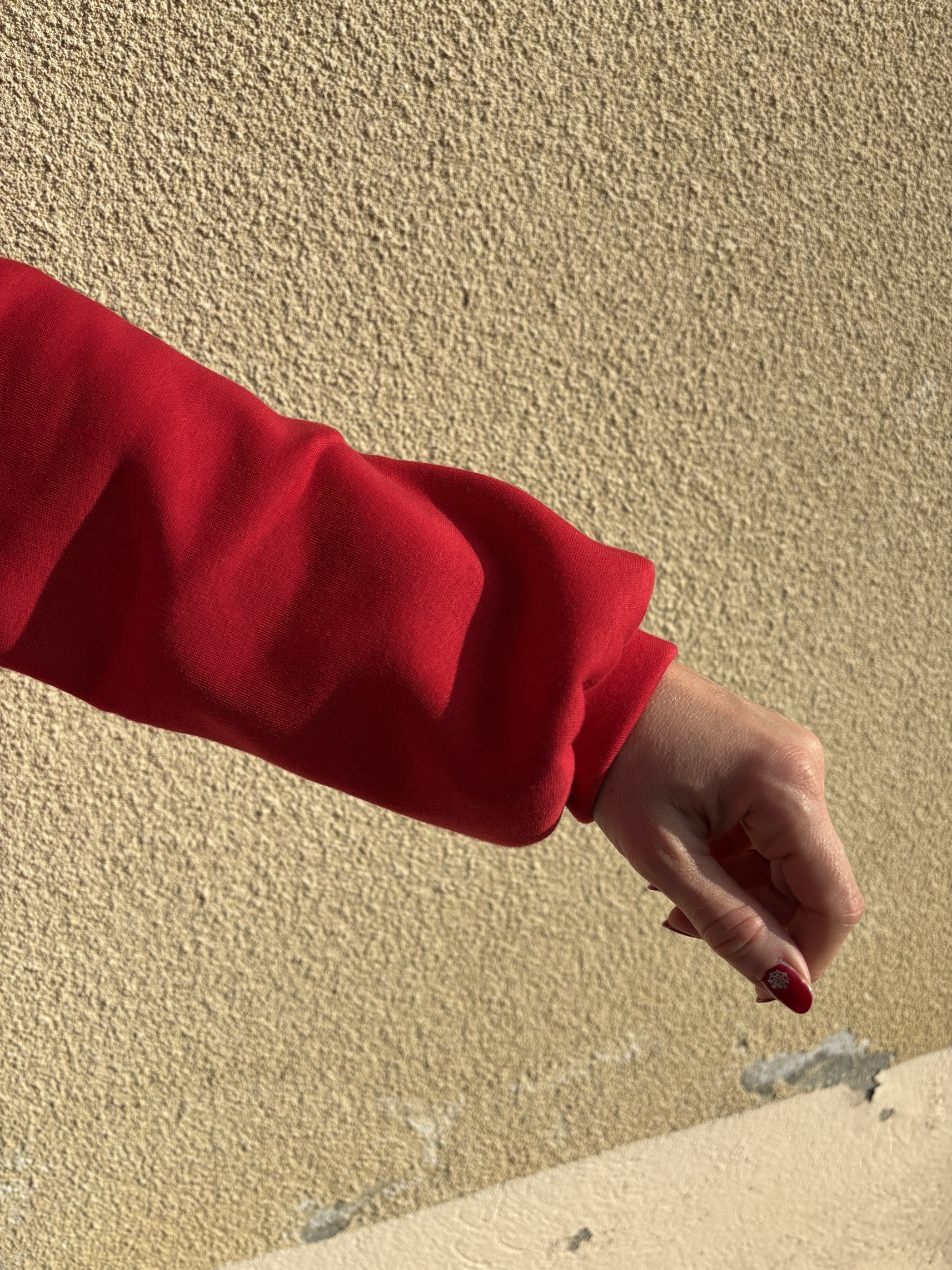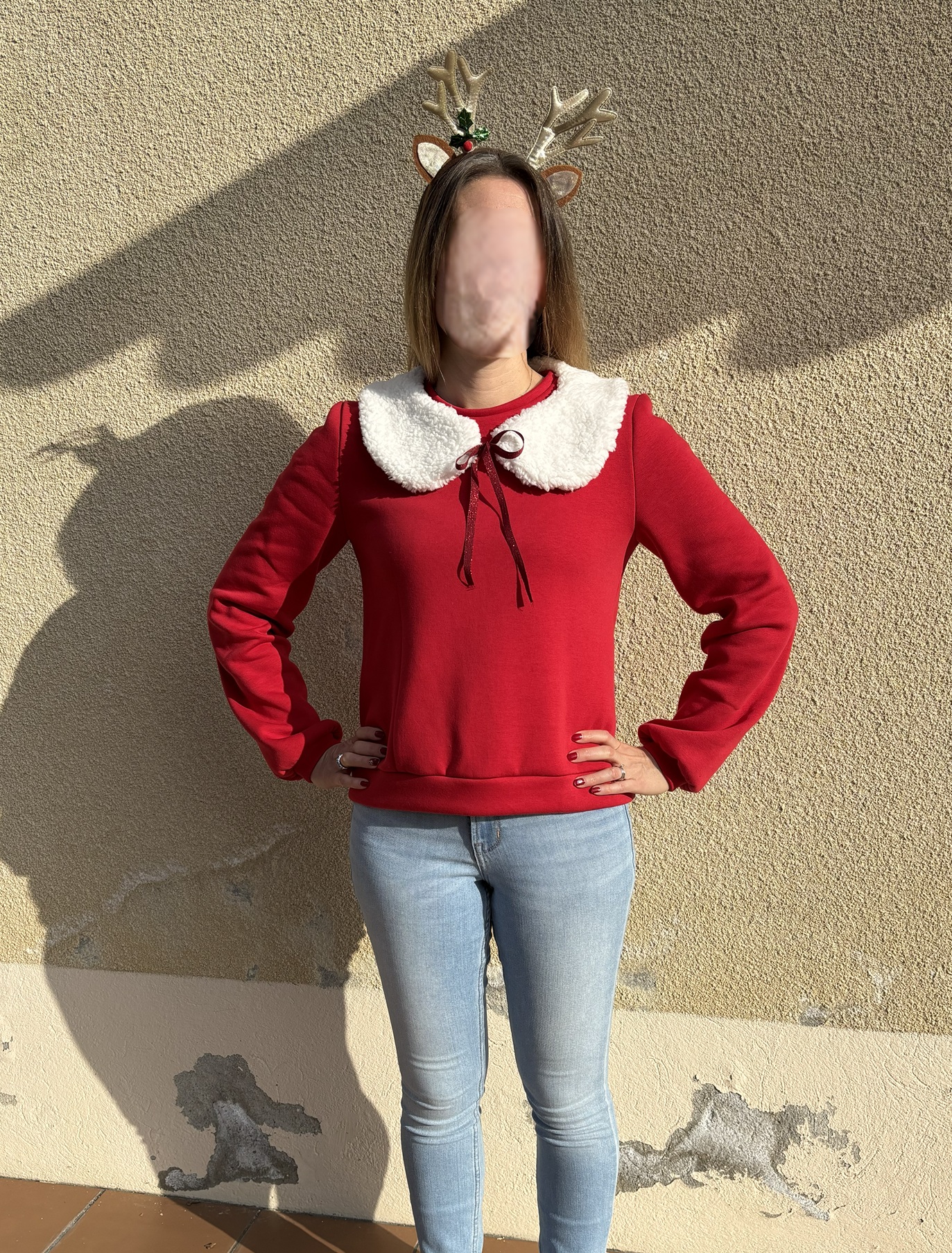 Pour ma première version, j’ai décidé de faire un pull pour Noël ! J’ai donc coupé une taille 38 dans un sweat rouge que j’avais déjà utilisé pour l’homme et Biquette, je ne sais plus d’où il vient, désolée. J’ai modifié le patron pour faire un dos simple, sans ouverture ni volant, et j’ai choisi la longueur courte ainsi que les poignets courts. Je n’ai pas fait de modification de stature car le patron est fait pour une stature de 1,65 et pour mon 1,60, ça passe !
