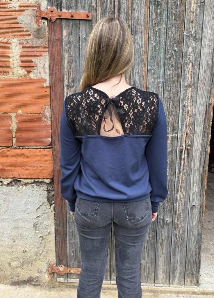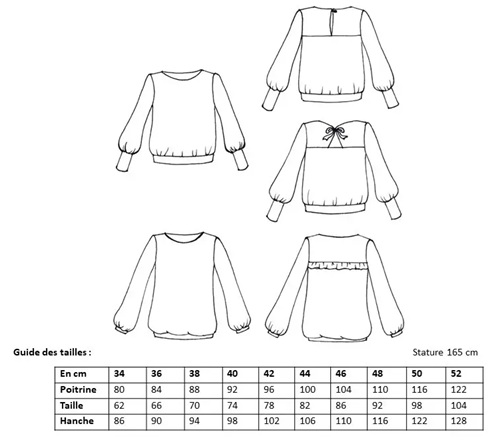 Téthys est un joli patron de sweat avec plusieurs options de longueurs, de manches, de poignets (courts ou longs) ainsi que plusieurs options pour le dos (avec volant, avec une ouverture large ou étroite, fermée par un nœud ou une bride). Bref, c’est le genre de patron qui permet de varier les plaisirs et ça, c’est vraiment chouette.
