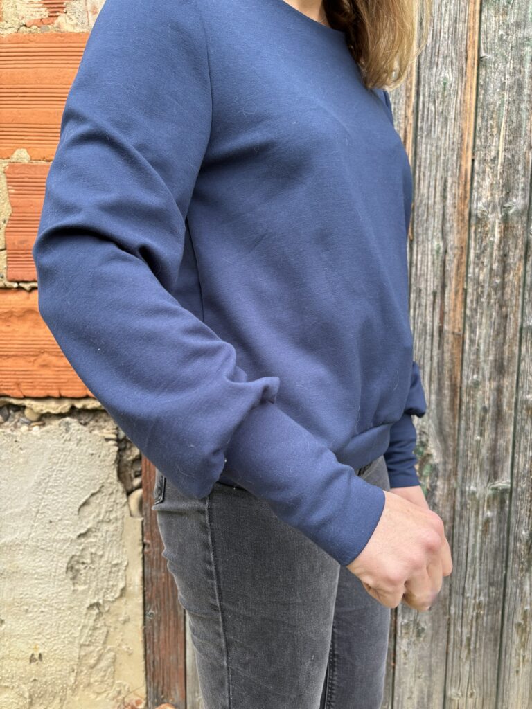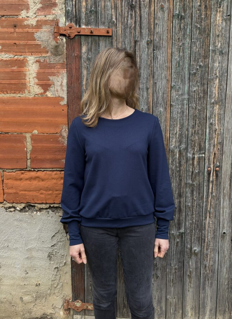 J’adore le résultat ! Le pull correspond bien à ma morphologie, il tombe bien et est très agréable à porter. Je n’ai pas fait de parementure pour le col ; j’ai plutôt opté pour une bande d’encolure car mon tissu est épais et j’avais peur qu’une parementure ne se voit en relief.