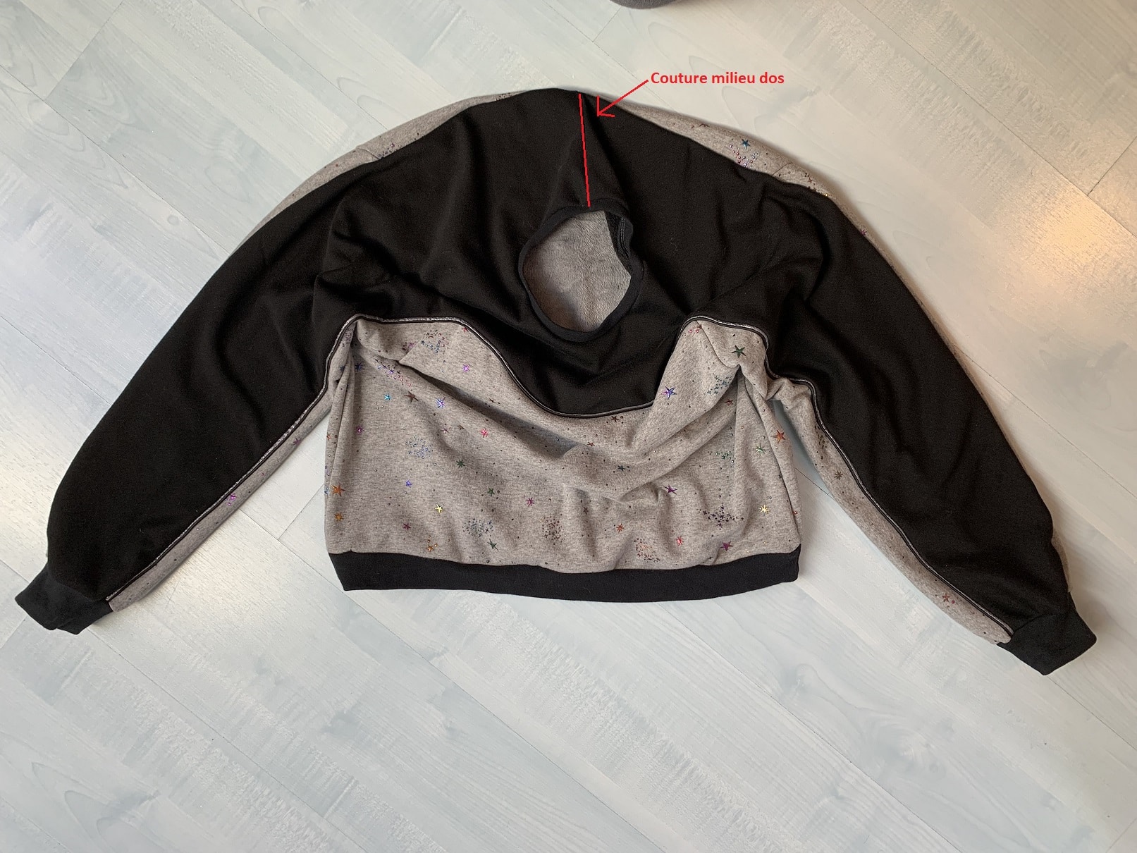 Le tissu noir vient de chez Driessen Stoffen, le tissu étoilé de chez Le petit lapin rouge, le passepoil de chez Mercerie Extra et le bord-côte de mon stock 😉