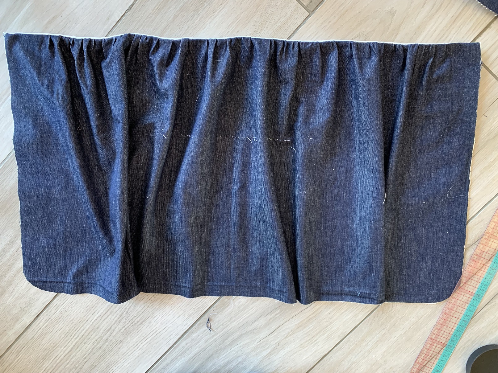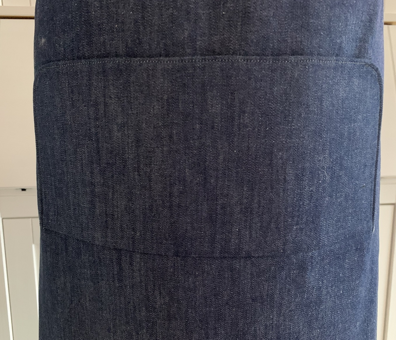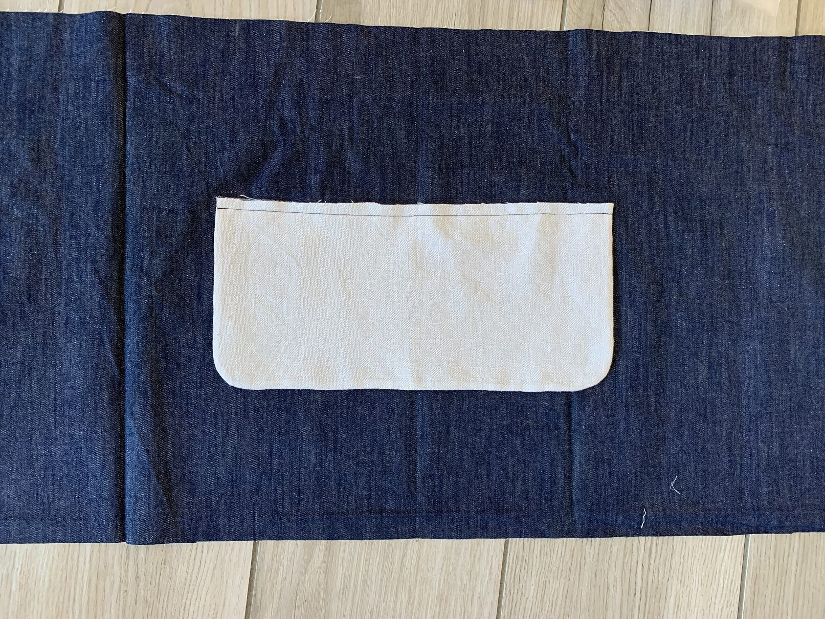 A ce stade, j’ai réalisé que la ceinture allait être trop courte ; j’ai donc rajouté 15 cm de chaque côté (jean et doublure). Puis j’ai cousu les petits côtés endroits contre endroit et je les ai retournés de façon à former de jolis coins. L’étape suivante consiste à coudre le bas du tablier et là, j’ai fait chauffer le découd-vite ! J’ai d’abord commencé par coudre la poche (toujours endroit contre endroit avec sa doublure) puis je l’ai cousue au tissus jean :