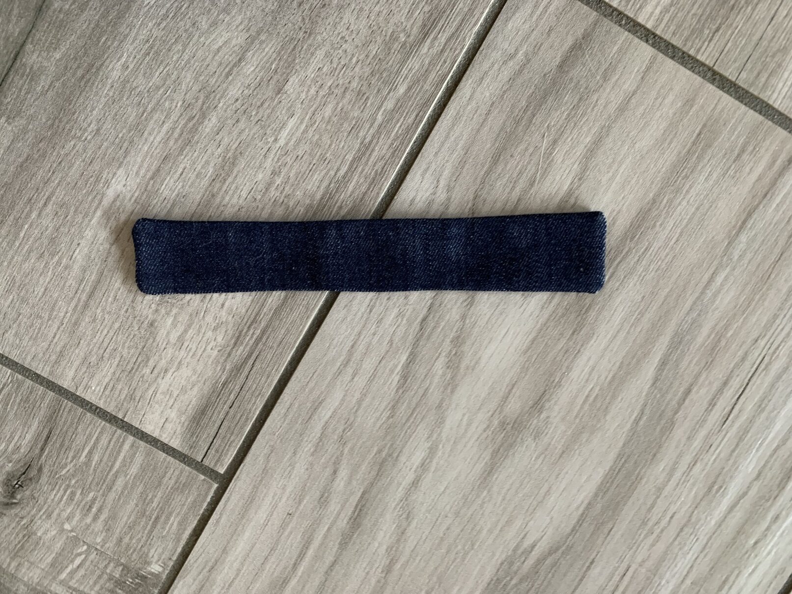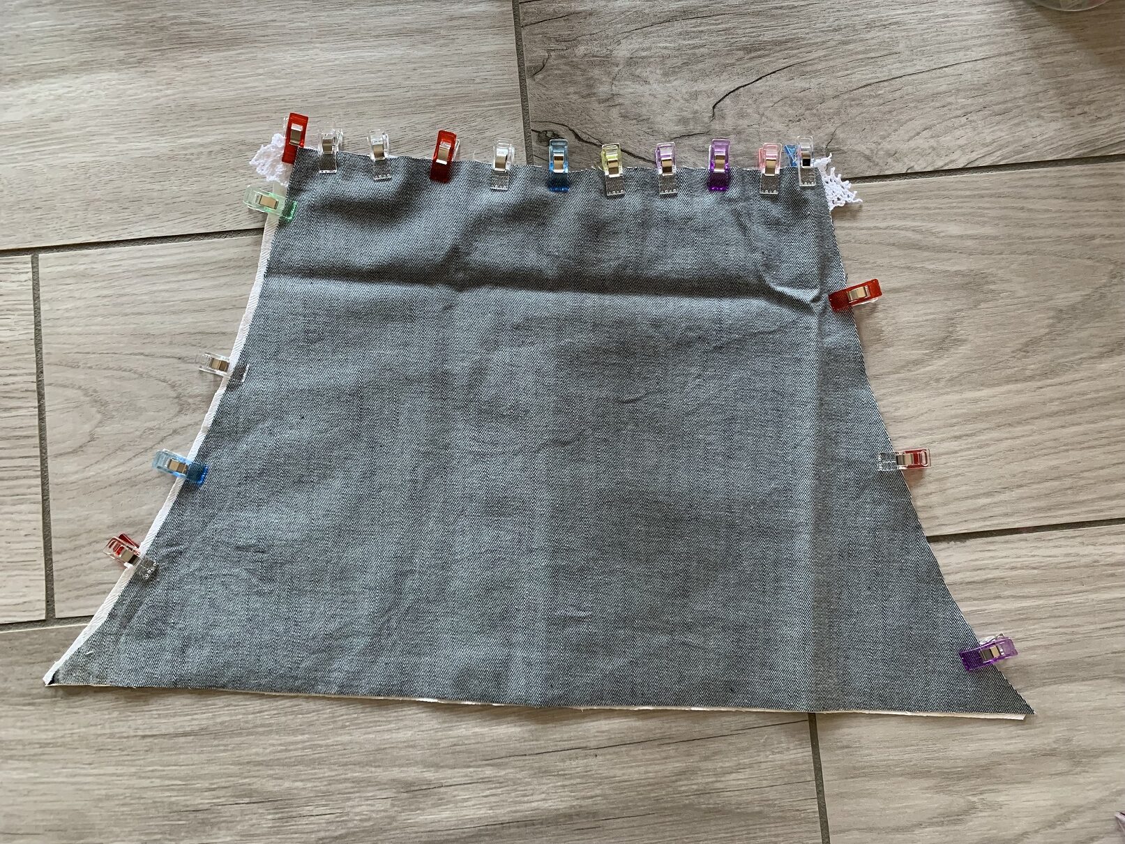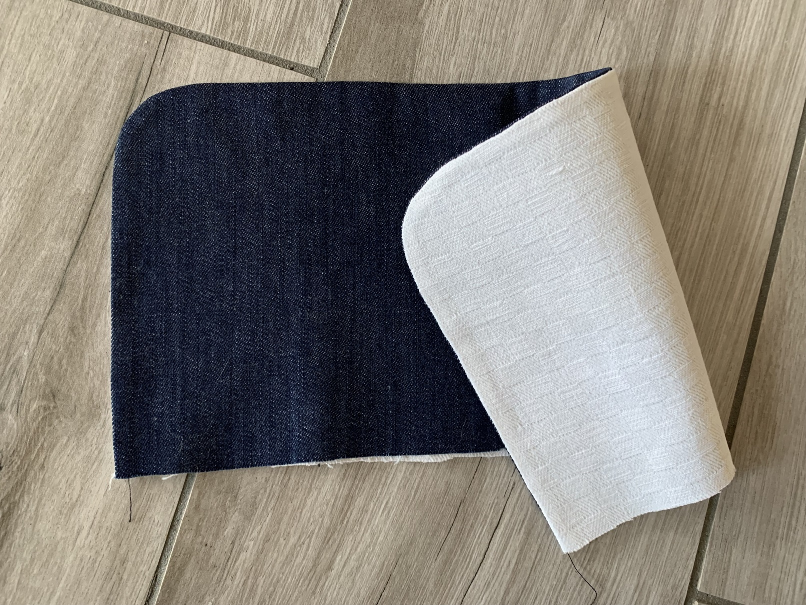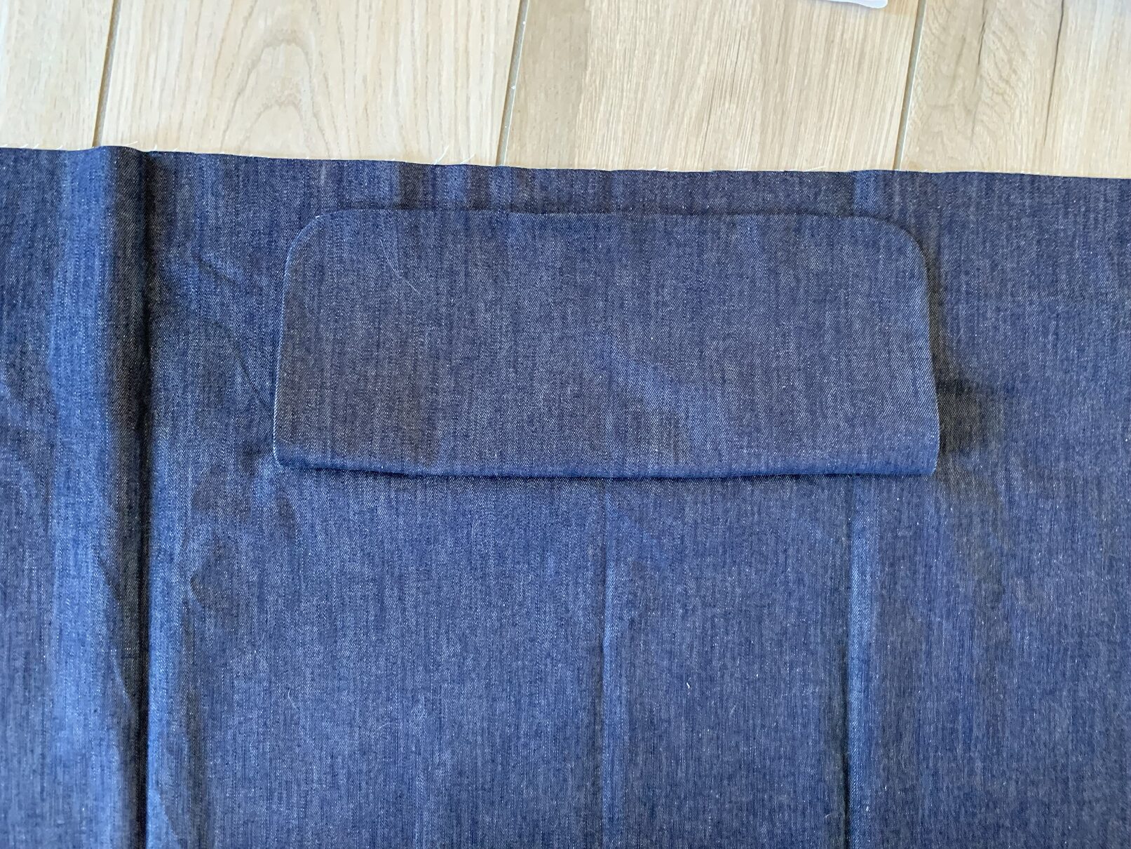 A ce stade, j’ai réalisé que la ceinture allait être trop courte ; j’ai donc rajouté 15 cm de chaque côté (jean et doublure). Puis j’ai cousu les petits côtés endroits contre endroit et je les ai retournés de façon à former de jolis coins. L’étape suivante consiste à coudre le bas du tablier et là, j’ai fait chauffer le découd-vite ! J’ai d’abord commencé par coudre la poche (toujours endroit contre endroit avec sa doublure) puis je l’ai cousue au tissus jean :