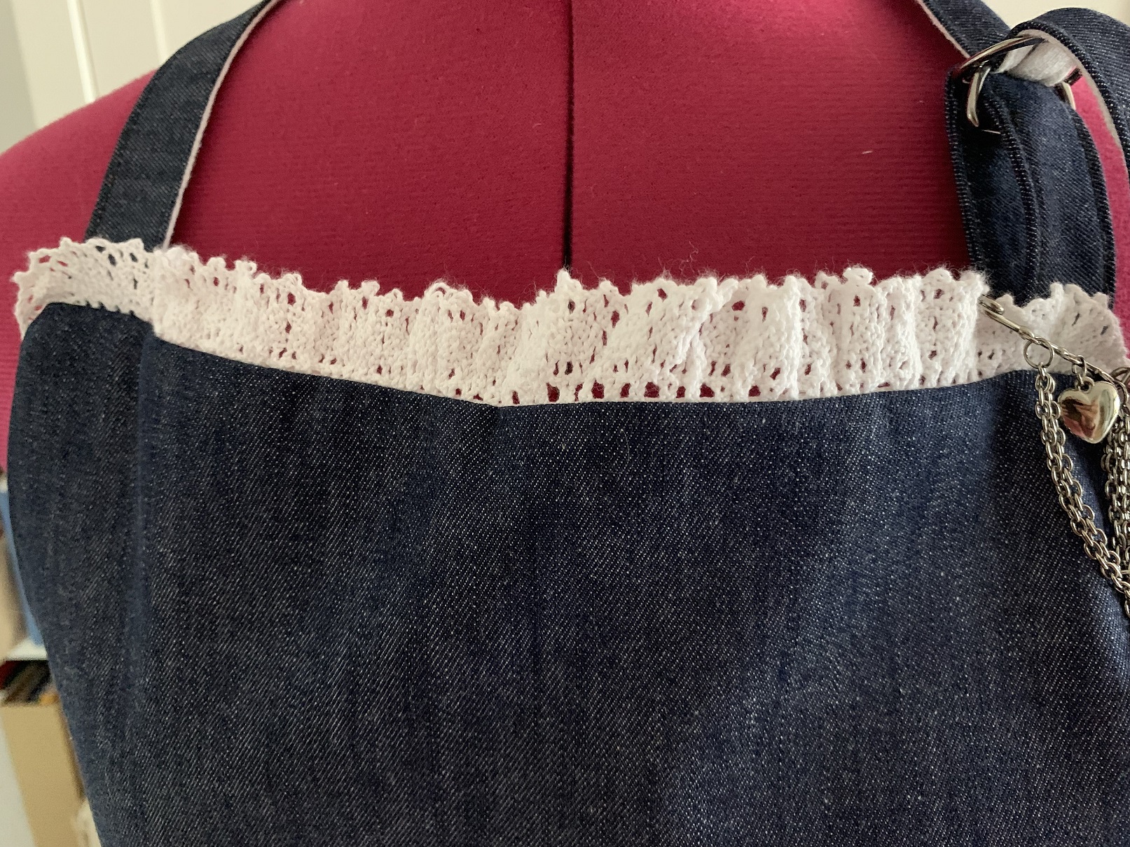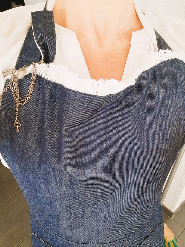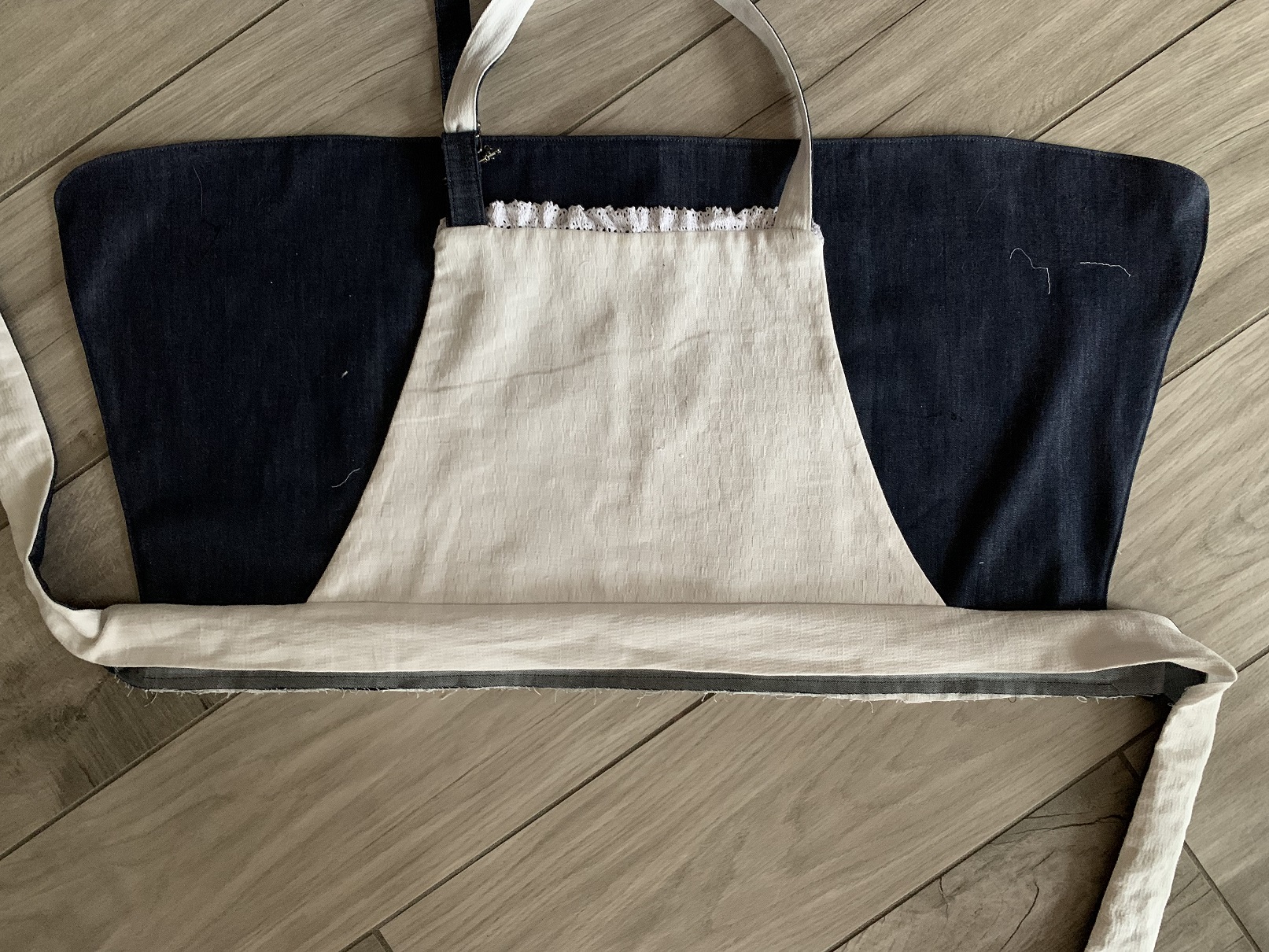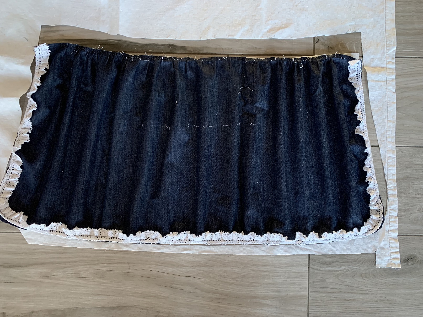 A ce moment, j’ai voulu froncer le haut du tablier (j’avais coupé le jean plus large que la doublure) et je me suis rendue compte qu’avec la poche, ça faisait vraiment moche, je l’ai donc retirée puis j’ai ajouté de la dentelle tout autour :