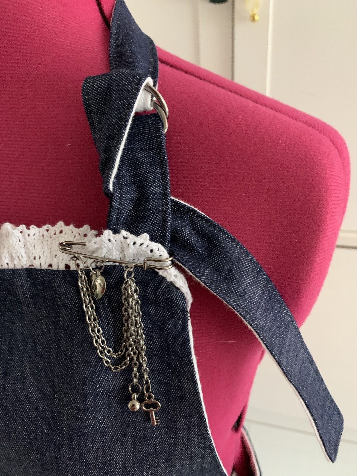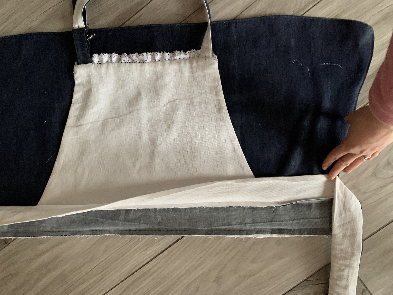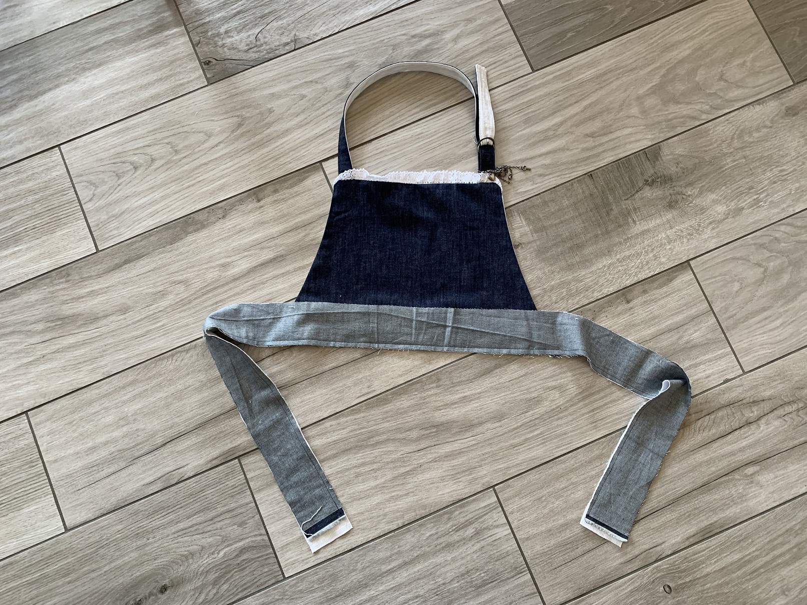 A ce moment, j’ai voulu froncer le haut du tablier (j’avais coupé le jean plus large que la doublure) et je me suis rendue compte qu’avec la poche, ça faisait vraiment moche, je l’ai donc retirée puis j’ai ajouté de la dentelle tout autour :