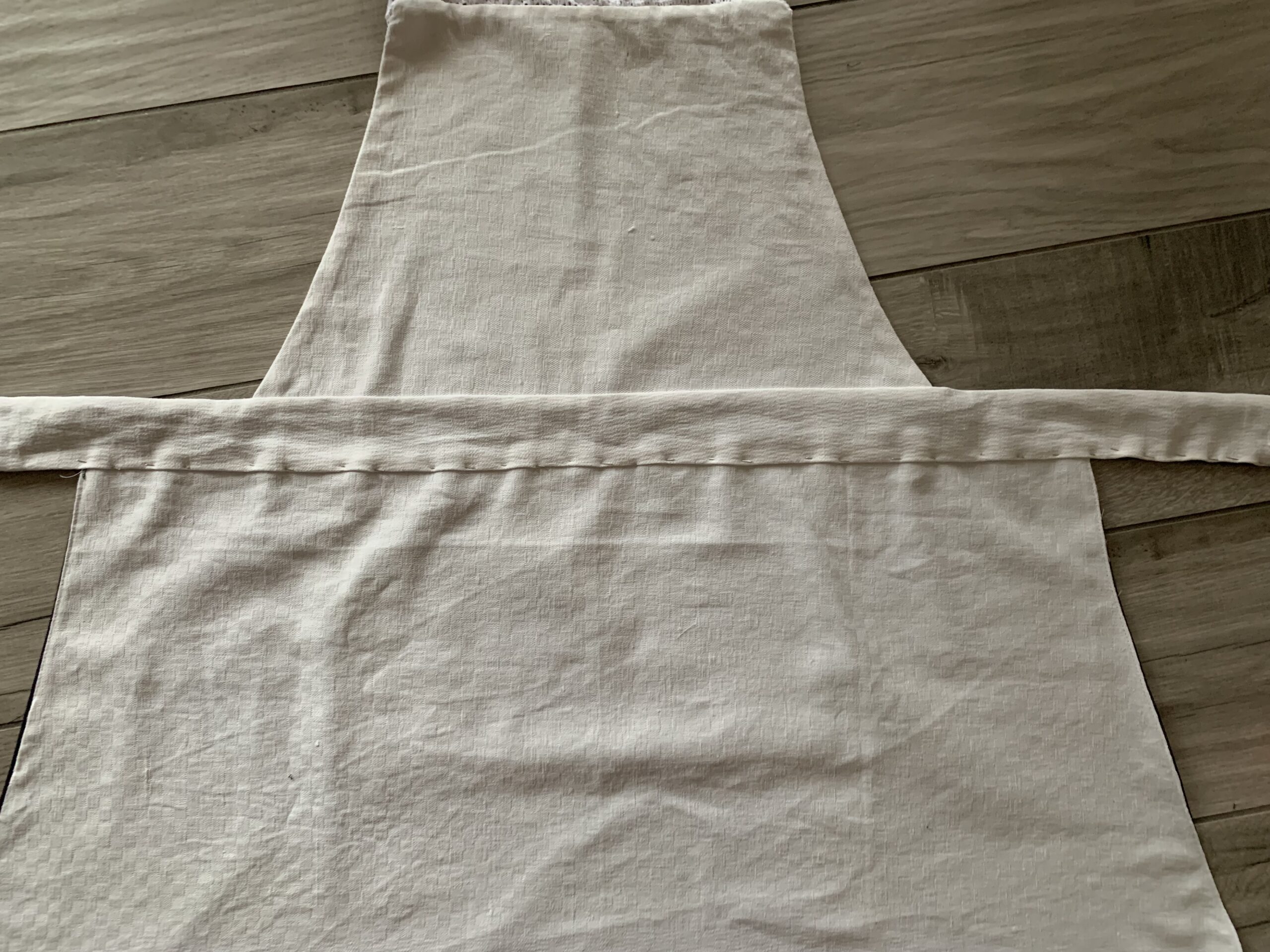 D’abord il m’a fallu trouver la matière. Un tablier se devant d’être résistant et non salissant, j’ai opté pour du jean foncé. Le jean protègera les vêtements portés sous le tablier et la couleur foncée masquera les tâches (une partie du moins). Optionnellement le jean est la matière que je préfère travailler et comme ce tablier était pour offrir, j’ai voulu y mettre ma patte personnelle. Ensuite je me suis posée la question de le doubler ou non. Le doubler rajoute des épaisseurs parfois difficile à coudre mais facilite aussi la couture car pas d’ourlet à faire. Et puis, un tablier doublé, ça protège mieux… je suis donc partie sur un tablier en jean doublé et pour cette doublure, j’ai choisi d’utiliser un tissu de récupération (mon côté écolo) : une ancienne nappe de ma très regrettée grand-mère (mon côté sentimental). Décidément, ce projet était partie pour être très perso !