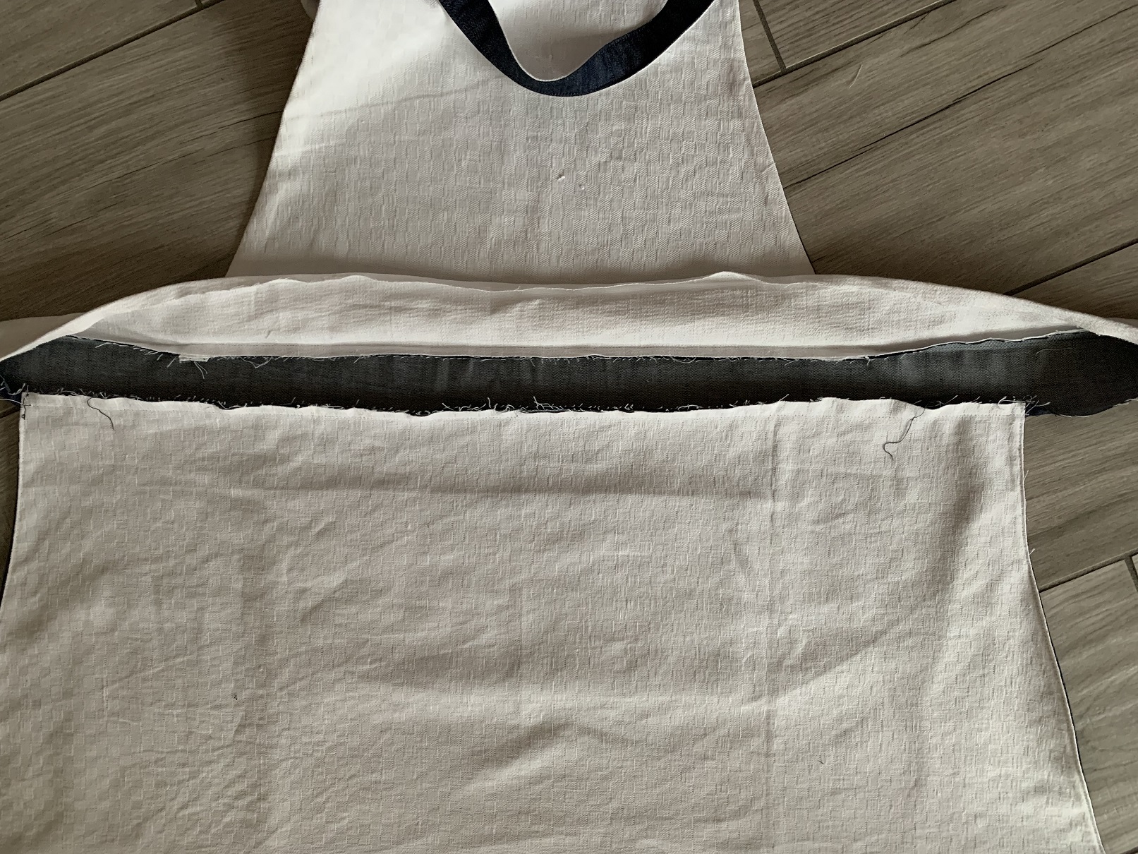 J’ai cousu puis retourné et j’ai ajouté la ceinture : j’ai placé chaque ceinture (jean + doublure) de part et d’autre de la bavette puis j’ai piqué le haut de la ceinture tout du long :